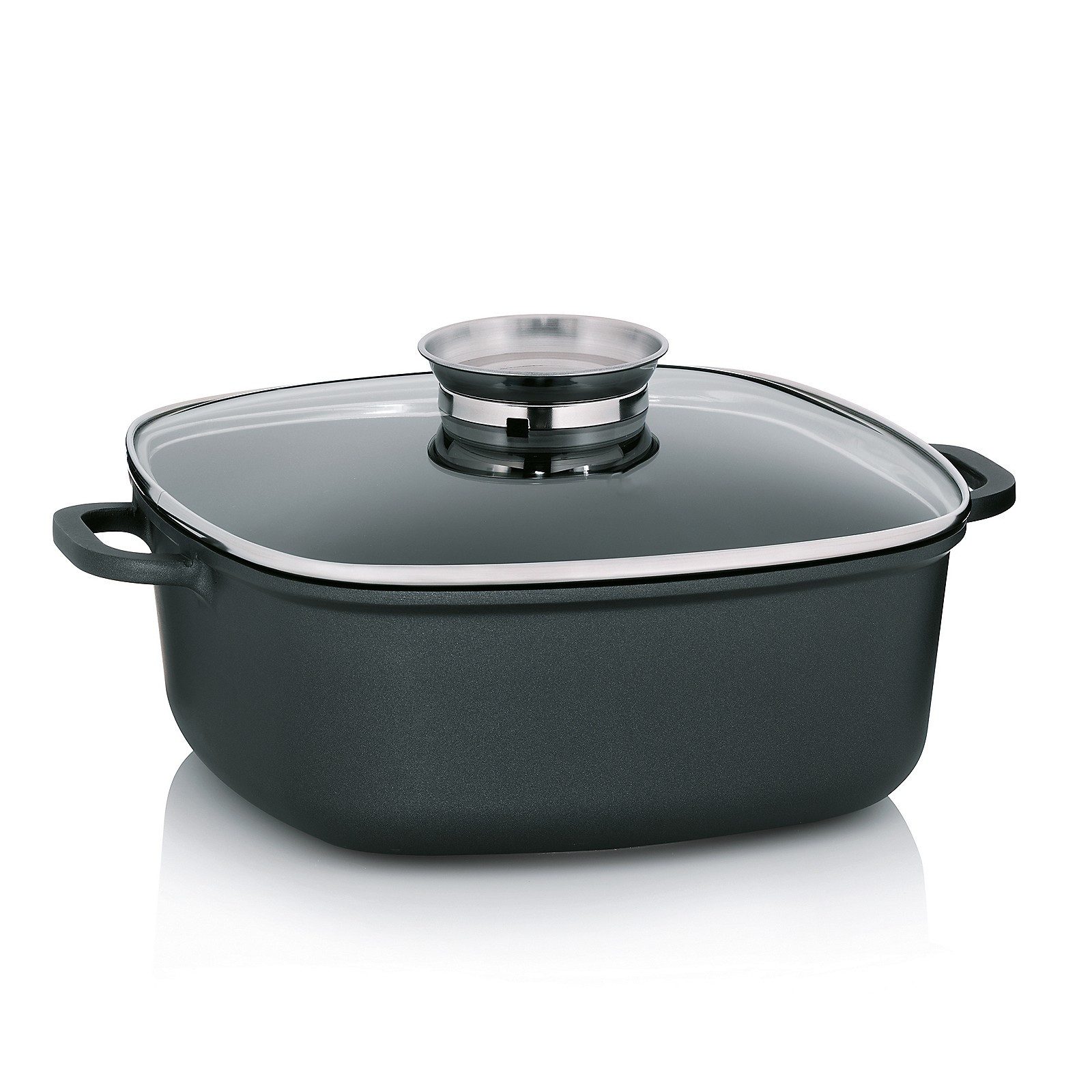 Wie wäre es mit einer Reise in die französische Region Burgund? Als Einstimmung könnte ein klassisches Coq au Vin, das Hühnchen im Rotwein dienen. In dieser eckigen Servierpfanne kann das Gericht ganz ungestört schmoren und der Wein wird einfach über den praktischen Aromaknopf zugegeben, ohne den Deckel anzuheben.