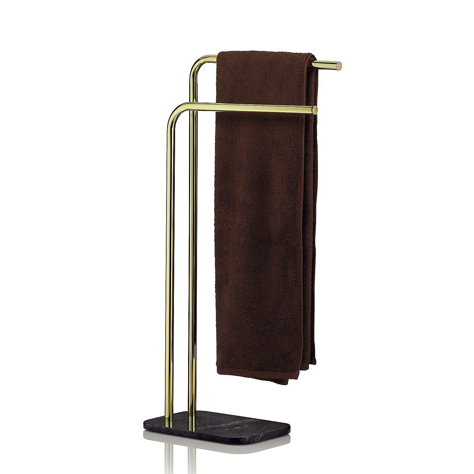 Ein toller Blickfang für Ihr Badezimmer. Dieser Handtuchhalter zieht garantiert alle Blicke auf sich. Die beiden Halterungen für zwei große Handtücher sind aus goldfarbenem Metall gearbeitet und parallel angeordnet. So bieten sie den Handtüchern genügend Freiraum zum Abtrocknen. Die schwere Bodenplatte aus schwarzem Marmor sorgt für einen sicheren Stand.