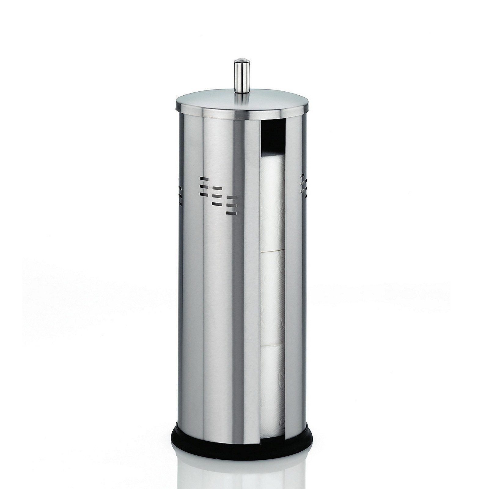 Deckel auf Toilettenpapierrollen rein. So ist immer für Papiernachschub gesorgt und es schaut trotzdem aufgeräumt auf. Und vom Platz her reicht dem Toilettenpapierbehälter eine kleine freie Ecke im WC aus. Die seitliche Öffnung im Behälter verrät dabei den aktuellen Stand des Papiervorrates.