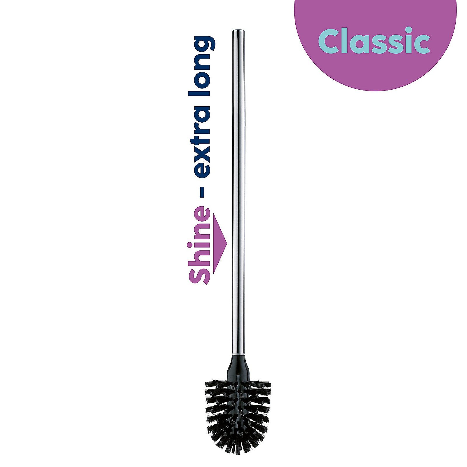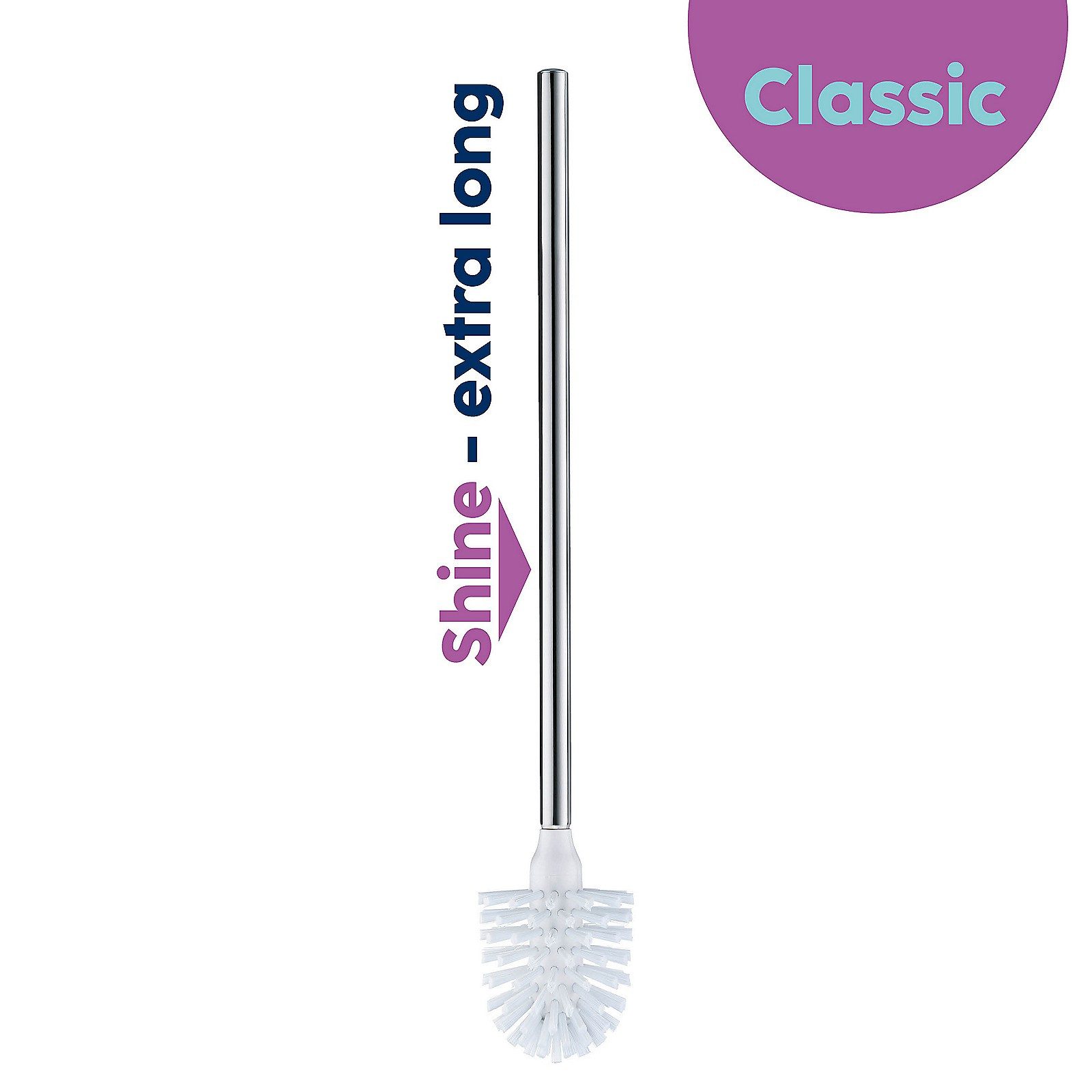 Eine praktische Ersatzbürste mit extra langem Griffstück für die WC-Garnitur für eine komfortablere Nutzung. Die Ersatz-WC-Bürste hat eine Длина von 52,0 cm und einen Durchmesser von 8 cm. Aus Edelstahl glänzend.