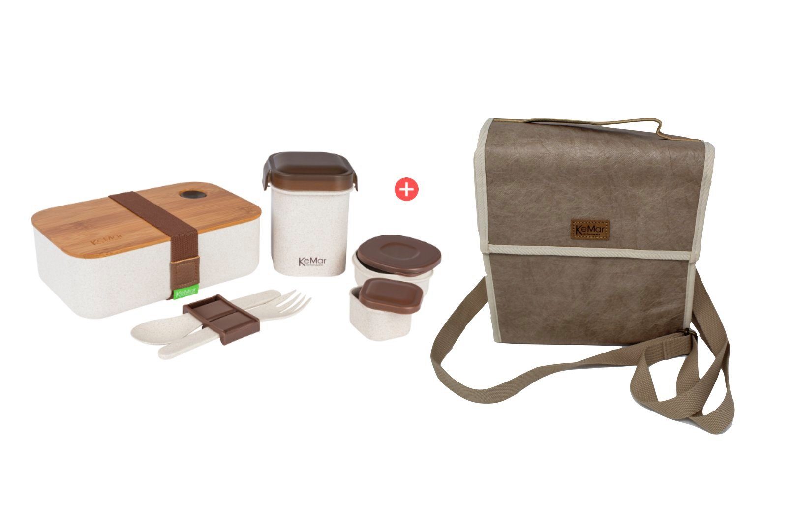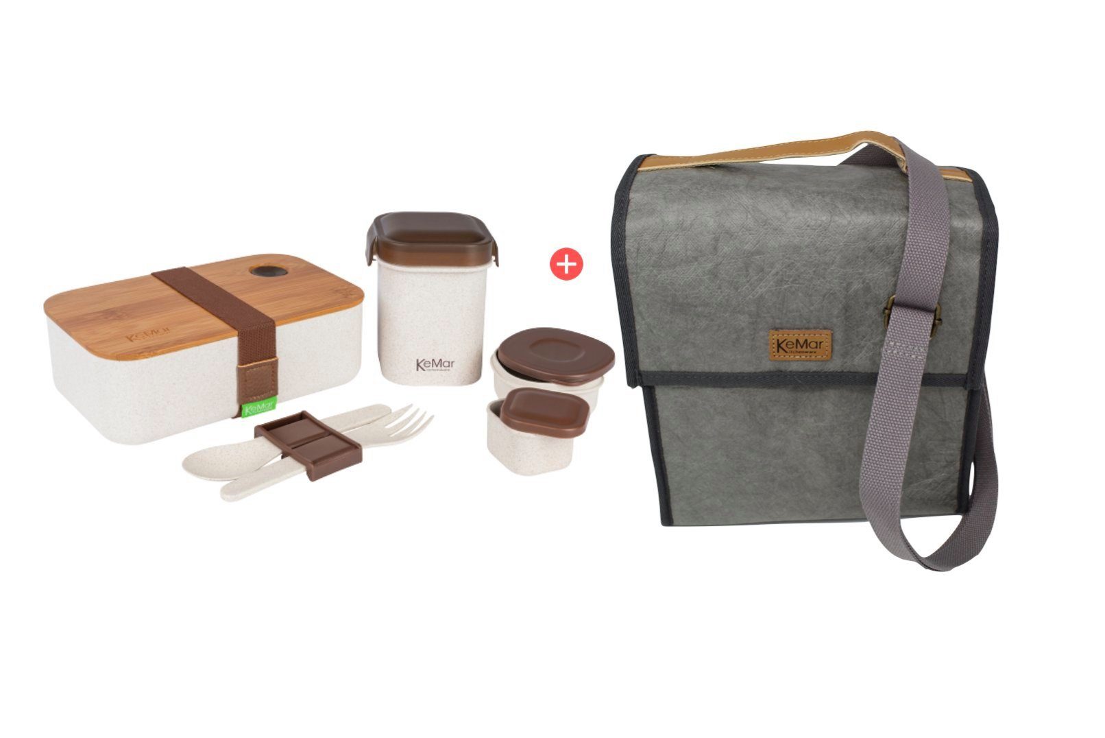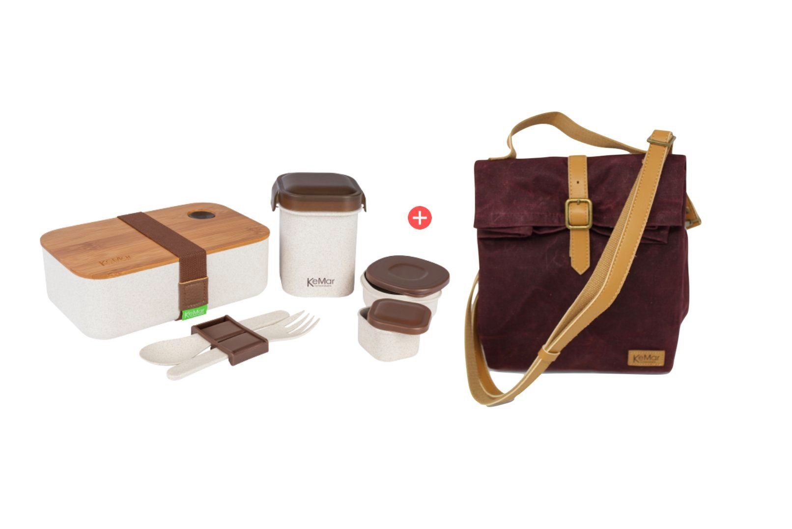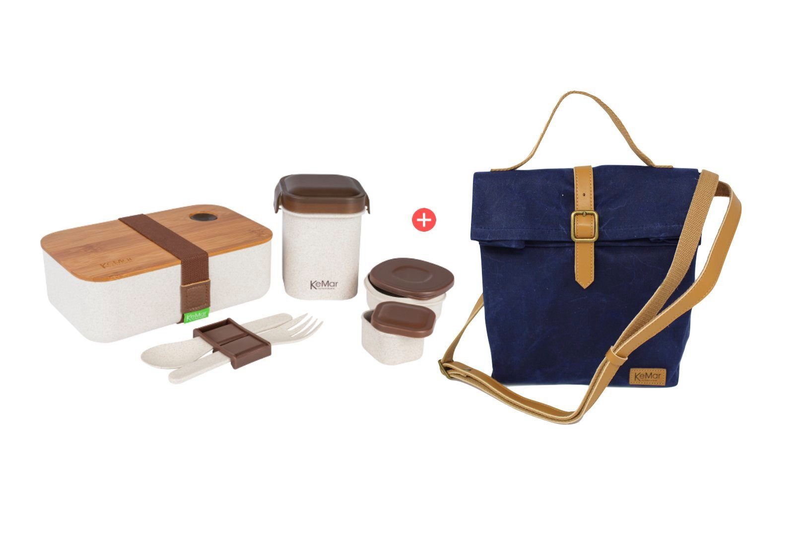 Lieferumfang | Lunchbox mit Bambusdeckel, 3 Behälter, Besteck, Tasche |