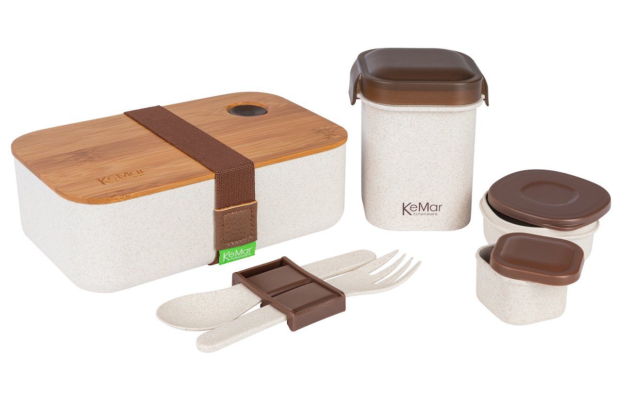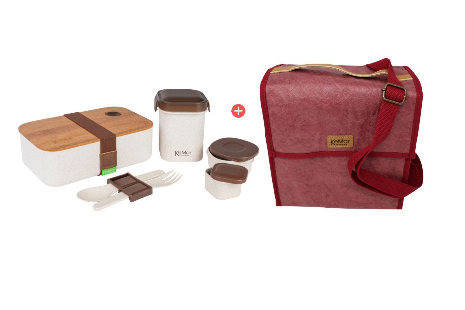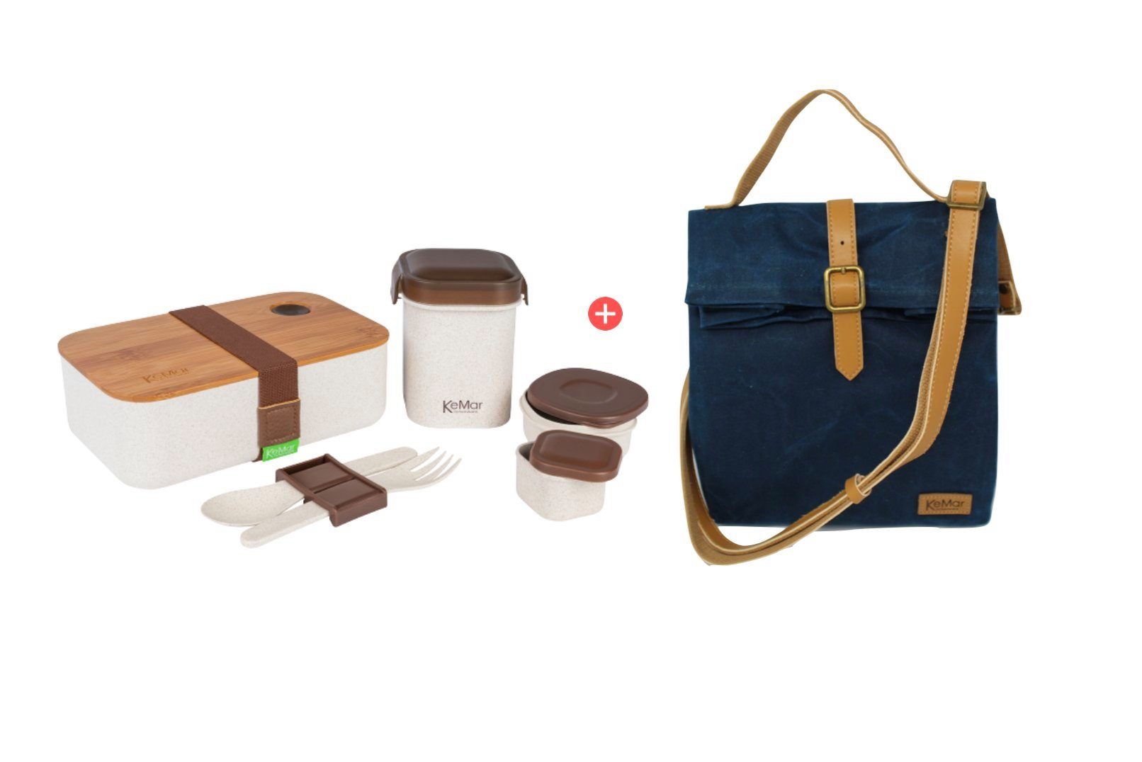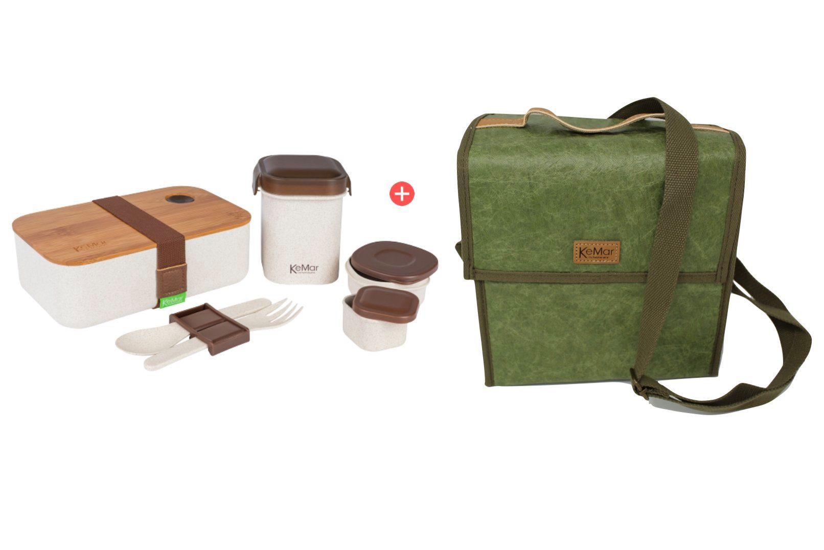 Lieferumfang | Lunchbox mit Bambusdeckel, 3 Behälter, Besteck, Tasche |