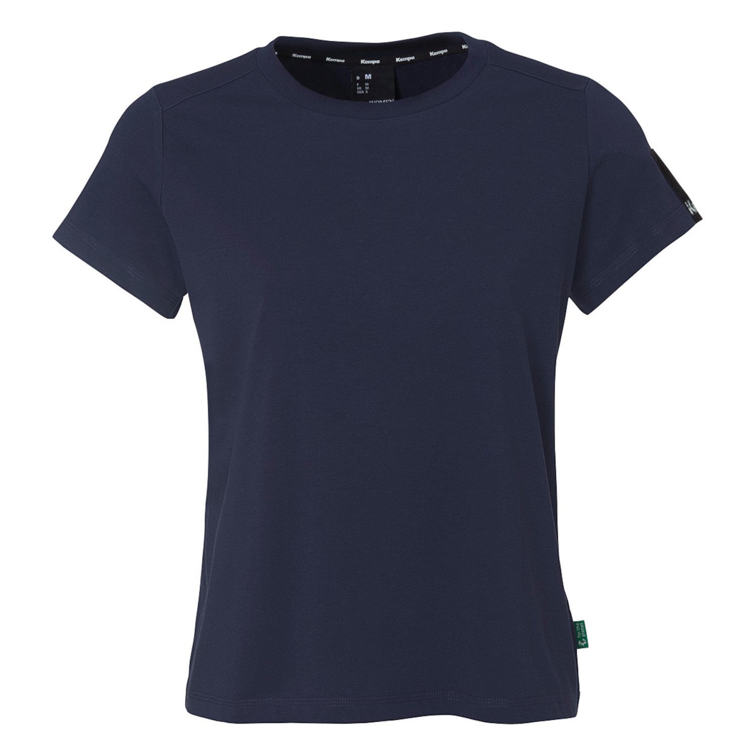 Kempa Damen T-Shirt STMNT. FOR THE PLANET . Kragen aus elastischer Rippe. Weblabels aus recycelter Baumwolle. Vorverlegte Schulternaht. Nackenband in Kontrastfarbe. Material: 60% Baumwolle, 40% Polyester.
