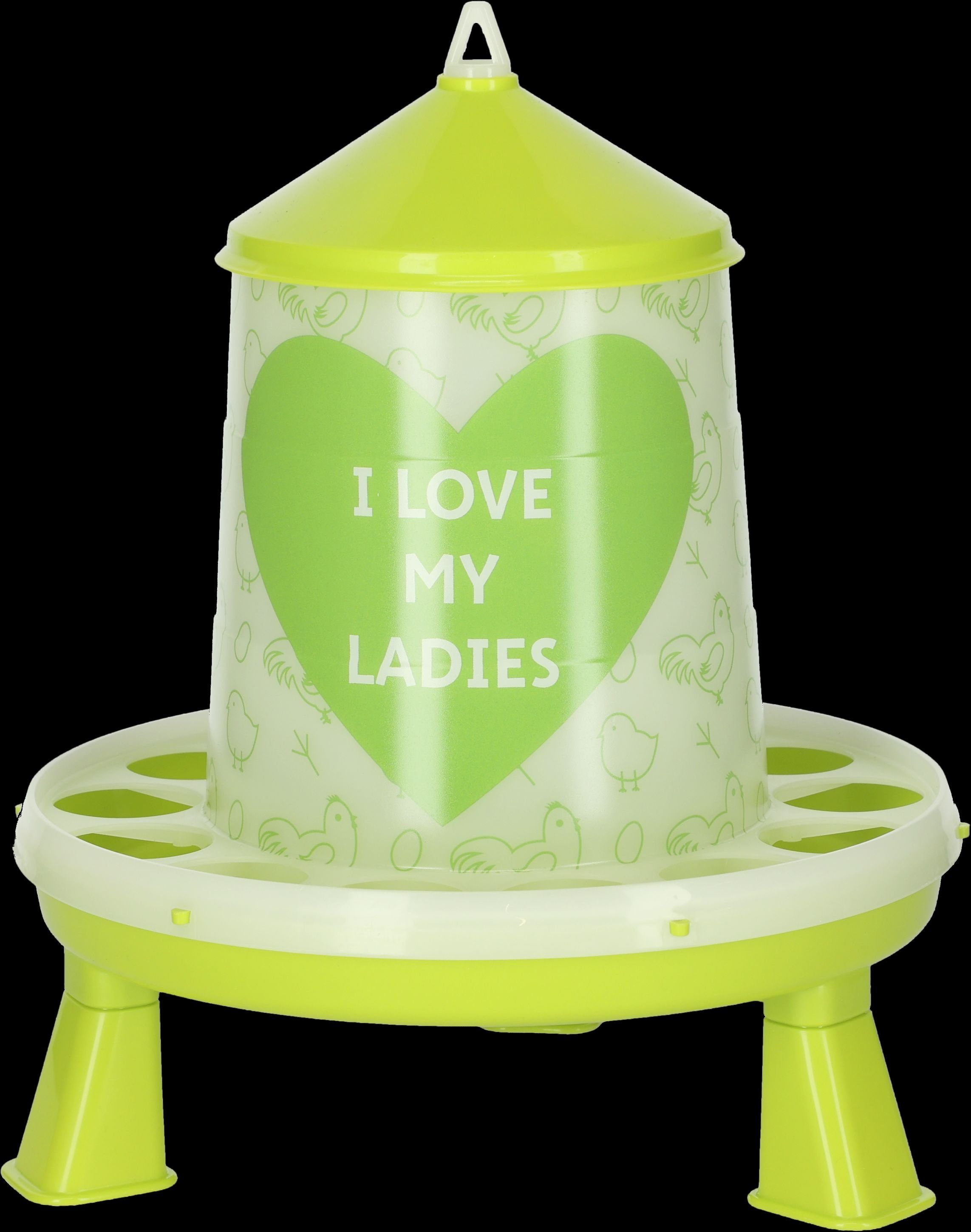 • Der Futterautomat besticht durch sein ansprechendes Farbschema in Grün/Weiß, das Ihrem Geflügelbereich eine frische und einladende Atmosphäre verleiht. Das "Ladies" Motiv rundet das Design mit einer charmanten Note ab.