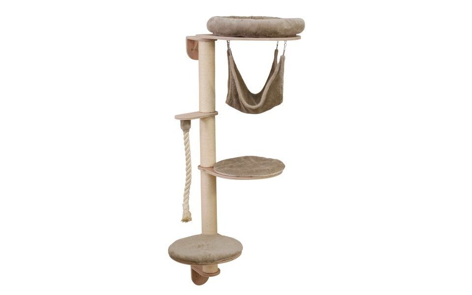 zeitloses Naturholzdesign gepaart mit kuscheligen Ruheplätzen Plüschkissen mit Klettband, abnehmbar großes Liegebett: ø 50 cm Liegeflächen: ø 40 cm Hängematte: 40 x 30 cm inkl. Sisalseil inkl. Befestigungsmaterial zur Wandbefestigung Sisal an den Säulen verklebt Stamm Ø: 9 cm