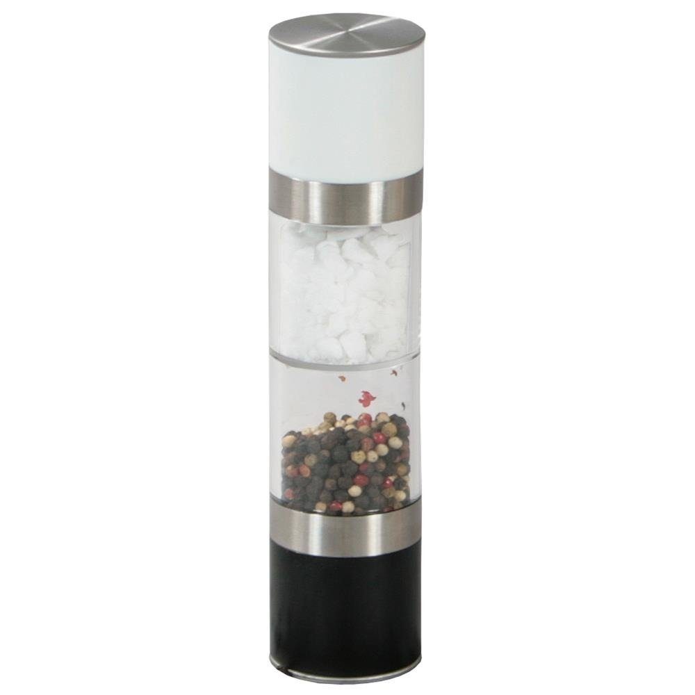 Die DUO Doppel-Salz- und Pfeffermühle der deutschen Firma Kesper besteht größtenteils aus Edelstahl. Dank dessen sieht dieser Artikel modisch und interessant zugleich sehr langlebig aus. Transparente Fenster ermöglichen es Ihnen, die Menge der Gewürze in den Tanks zu beobachten, und das verwendete Material ist ideal für den Kontakt mit Lebensmitteln. Der enge Verschluss garantiert die Frische und das Aroma von Pfeffer und schützt die Salzkristalle vor übermäßiger Feuchtigkeit und Anbacken. Der Schleifmechanismus besteht aus Metall, was die Haltbarkeit des Produkts und die höchste Verwendungsqualität garantiert. Die Mühle besteht aus zwei separaten Fächern für Gewürze.