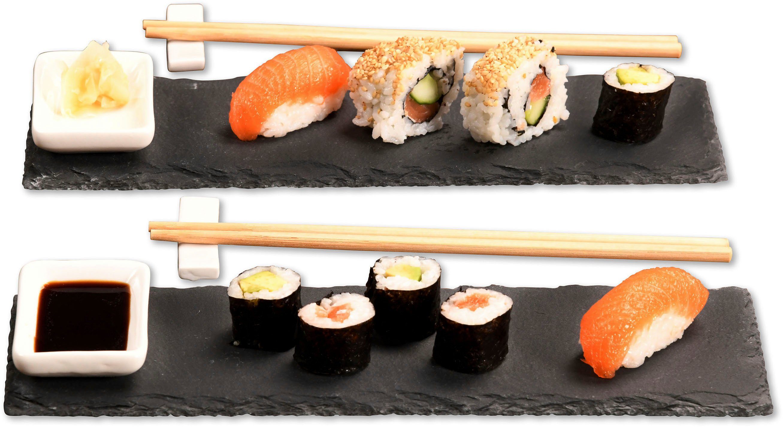 Lieferumfang | 2 Paar Sushi-Essstäbchen, 2 Schieferplatten, 2 Sushi-Stäbchenhalter aus Keramik |