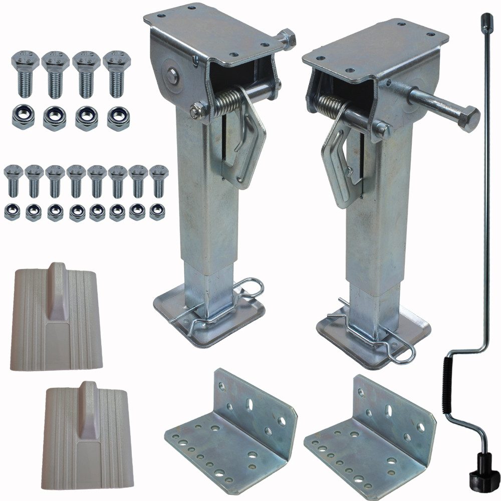 Hinweis: Ideal zur Abstützung von Wohnmobilen, Wohnwagen und Anhängern. Durch drehen mit der mitgelieferten Handkurbel an der Antriebswelle klappen die Stützen von der Senkrechten in die Waagerechte und verschwinden unter dem Fahrzeug. Dreht man in die andere Richtung schwenkt die Stütze in die Senkrechte und fährt aus.