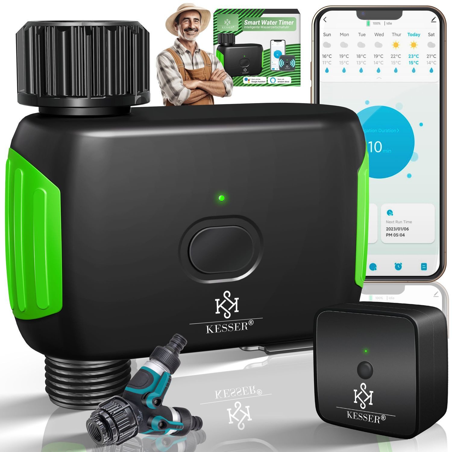 KESSER Bewässerungscomputer vereint 360° drehbaren Anschluss, hochwertigen Filter, IP55 Schutz, smarte Steuerung per App, Regensensor, Automatikfunktion und 20 Timer-Zeitpläne für vielseitige Bewässerungsanforderungen im Garten und darüber hinaus.