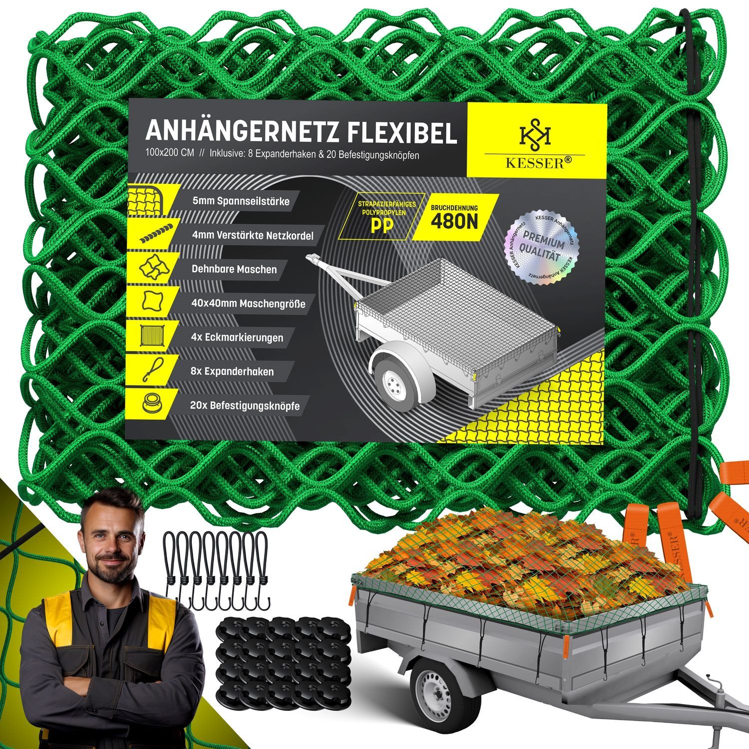KESSER® Anhängernetz Flexibel aus strapazierfähigem PP-Gewebe, mit 5mm Spannseilstärke & 4mm verstärkter Netzkordel, dehnbare Maschen für größtmögliche Flexibilität und einer Bruchlast von 480N pro Masche, 40x40mm Maschengröße, 4 Eckmarkierungen & Expanderhaken sowie 20 Befestigungsknöpfen