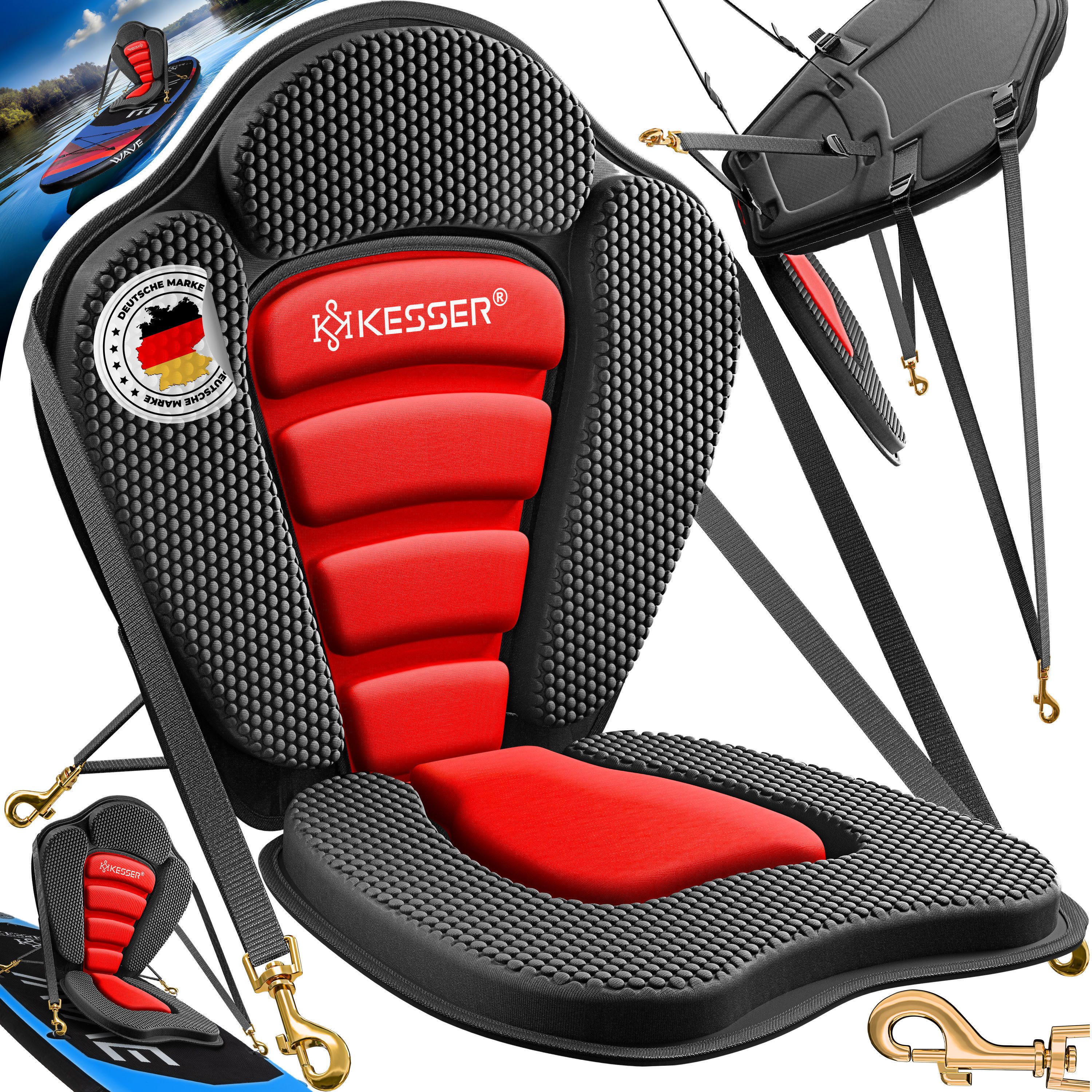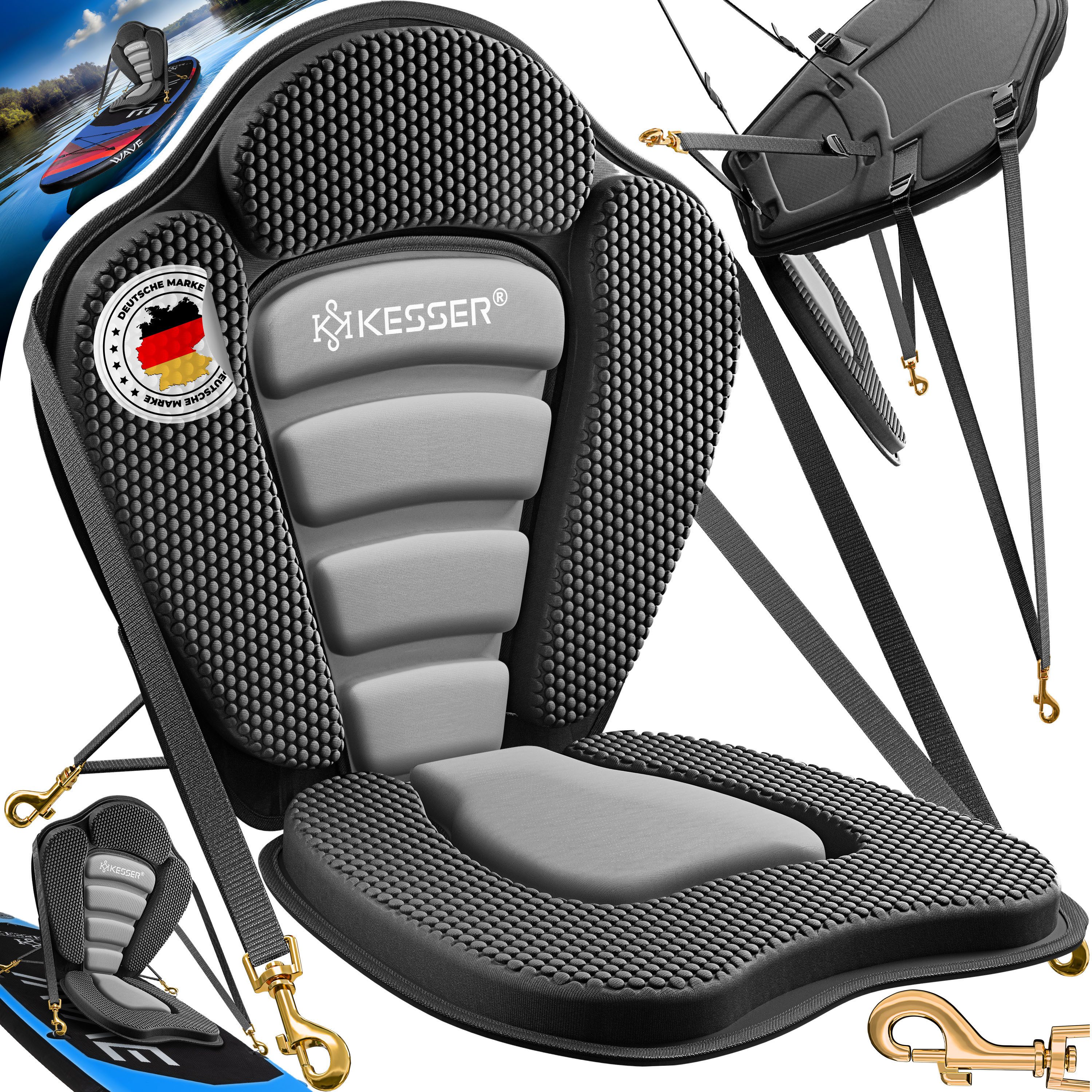 Mit dem KESSER SUP Kajak-Sitz haben Sie jede Menge Spaß und halten sich durch Sport fit!Der KESSER Kajak Sitz ermöglicht ein sehr bequemes sitzen auf dem Paddleboard. Die Befestigung auf das Paddleboard ist mithilfe von Gurten und Karabinern an den D-Ringen des Boards sehr einfach.