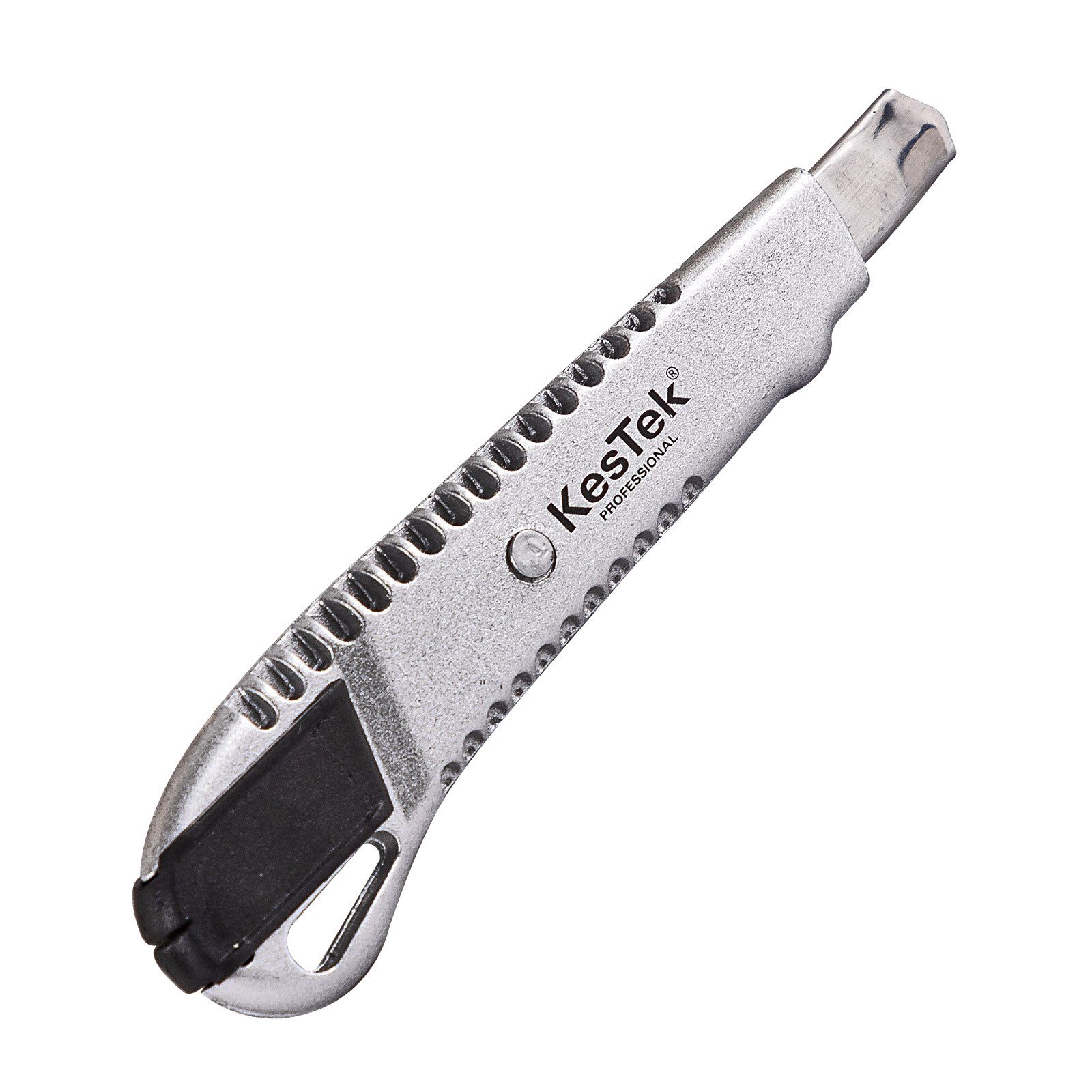 Original KesTek Alu Cutter 9mm mit schwarzer SK5 Klinge. Unentbehrlicher Helfer in Haushalt, Garten, Hobby und Beruf. Der ergonomische geformte Griff liegt gut in der Hand und erlaubt einen festen Druck auf das zu schneidende Material. Die Metallführung gewährleistet eine präzise Schnittlinie und verhindert das Ausbrechen des Cutters nach oben.