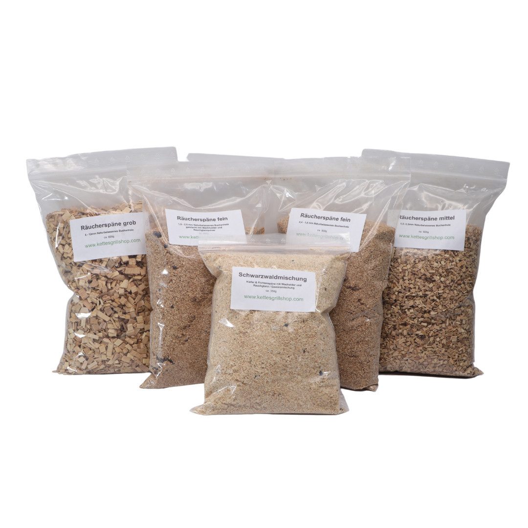Am Start ein Starter Set mit Räucherspänen ideal für Fisch und Fleisch Buchenspäne fein 1 x 600g ca Buchenspäne mittel 1x 600g ca 1 x 500g Buchenspäne grob Buchenspäne mit ganzen Wachholder 1x 400g Schwarzwaldmischung Kiefer / Fichte dazu Wachholder zerstoßen 1x 350 g Gern auch andere Mengen auf Anfrage