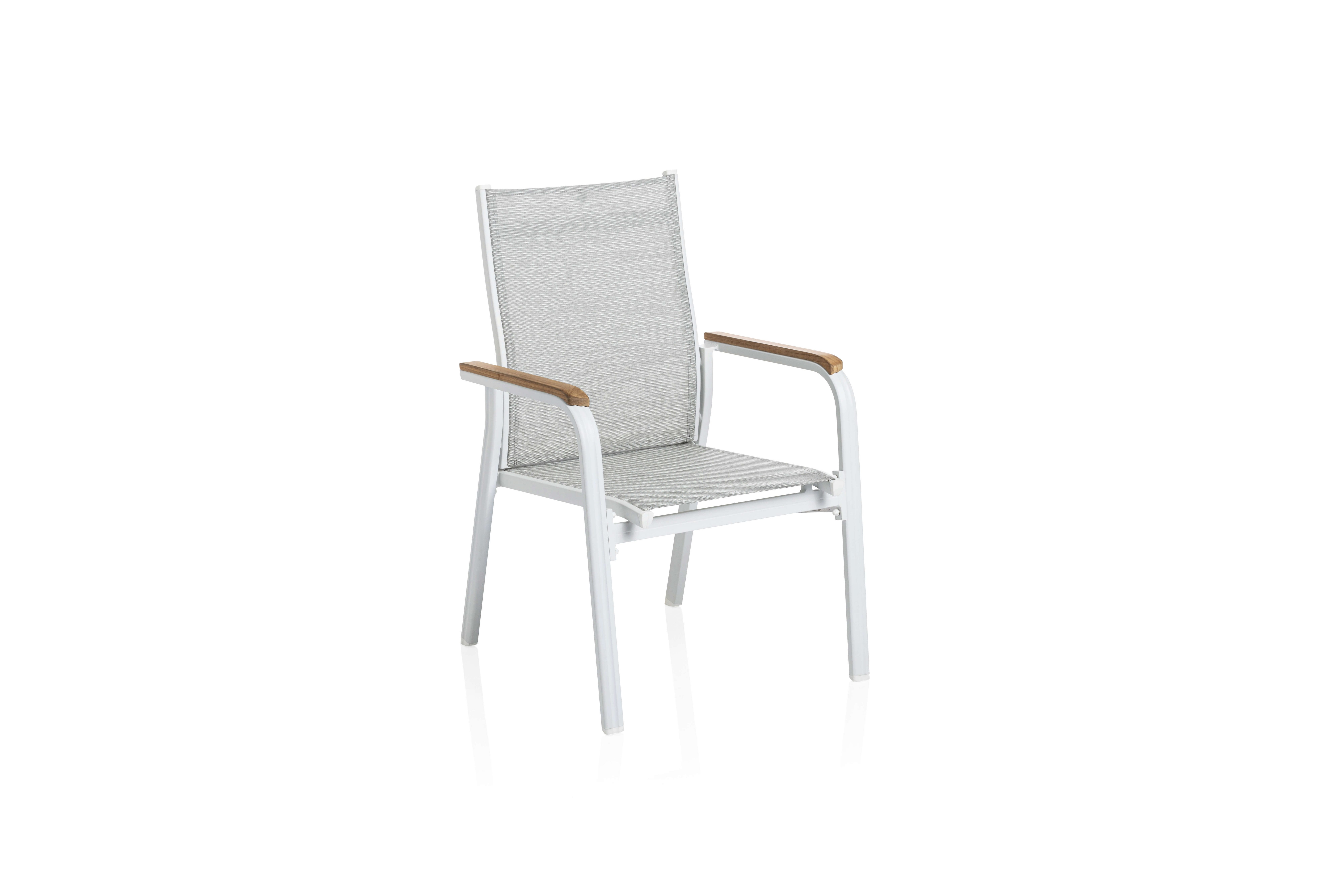 Artikelnummer: 80507 GRANADA Stapelsessel: Komfort und Eleganz für den Außenbereich Erleben Sie stilvollen Komfort und herausragende Qualität mit dem GRANADA Stapelsessel von KETTLER. Dieser elegante Stapelsessel ist die perfekte Ergänzung für Ihren Garten, Ihre Terrasse oder Ihren Balkon. Mit seiner zeitlosen Farbgebung in weiß matt/hellgrau fügt sich der Sessel harmonisch in jede Umgebung ein und setzt gleichzeitig moderne Akzente.Gefertigt aus robustem Aluminium und hochwertigem Outdoorgewebe überzeugt der GRANADA Stapelsessel durch seine Witterungsbeständigkeit und Langlebigkeit. Das Material ist speziell darauf ausgelegt, Wind und Wetter zu trotzen, sodass Sie jahrelang Freude an diesem Produkt haben werden. Dank seiner korrosionsbeständigen Eigenschaften bleibt der Sessel auch bei häufigem Gebrauch im Freien in erstklassigem Zustand.Mit seinen großzügigen Maßen von ca. 69 cm Длина, ca. 66 cm Breite und ca. 98 cm Höhe bietet der Stapelsessel ein komfortables Sitzgefühl. Die ergonomisch geformte Rückenlehne und die Armlehnen aus Teakholz sorgen für zusätzlichen Komfort und eine natürliche Optik. Die verwendeten Materialien sind pflegeleicht, sodass Sie den Sessel mühelos reinigen können.Ein besonderes Highlight ist die Stapelbarkeit des GRANADA Sessels. Dadurch lässt sich der Sessel platzsparend verstauen, wenn er nicht benötigt wird. Ob bei einem gemütlichen Abendessen im Freien oder einem entspannten Nachmittag in der Sonne – dieser Sessel ist vielseitig einsetzbar und erfüllt höchste Ansprüche an Funktionalität und Design.Der GRANADA Stapelsessel wurde speziell für den Einsatz im Außenbereich konzipiert und besticht durch seine hohe Belastbarkeit. Seine strapazierfähigen Materialien machen ihn resistent gegen Schimmel und UV-Strahlung, während die pulverbeschichtete Oberfläche zusätzlichen Schutz bietet. Mit einer maximalen Nutzergewichtskapazität von ca. 120 kg ist der Sessel für unterschiedlichste Bedürfnisse geeignet.