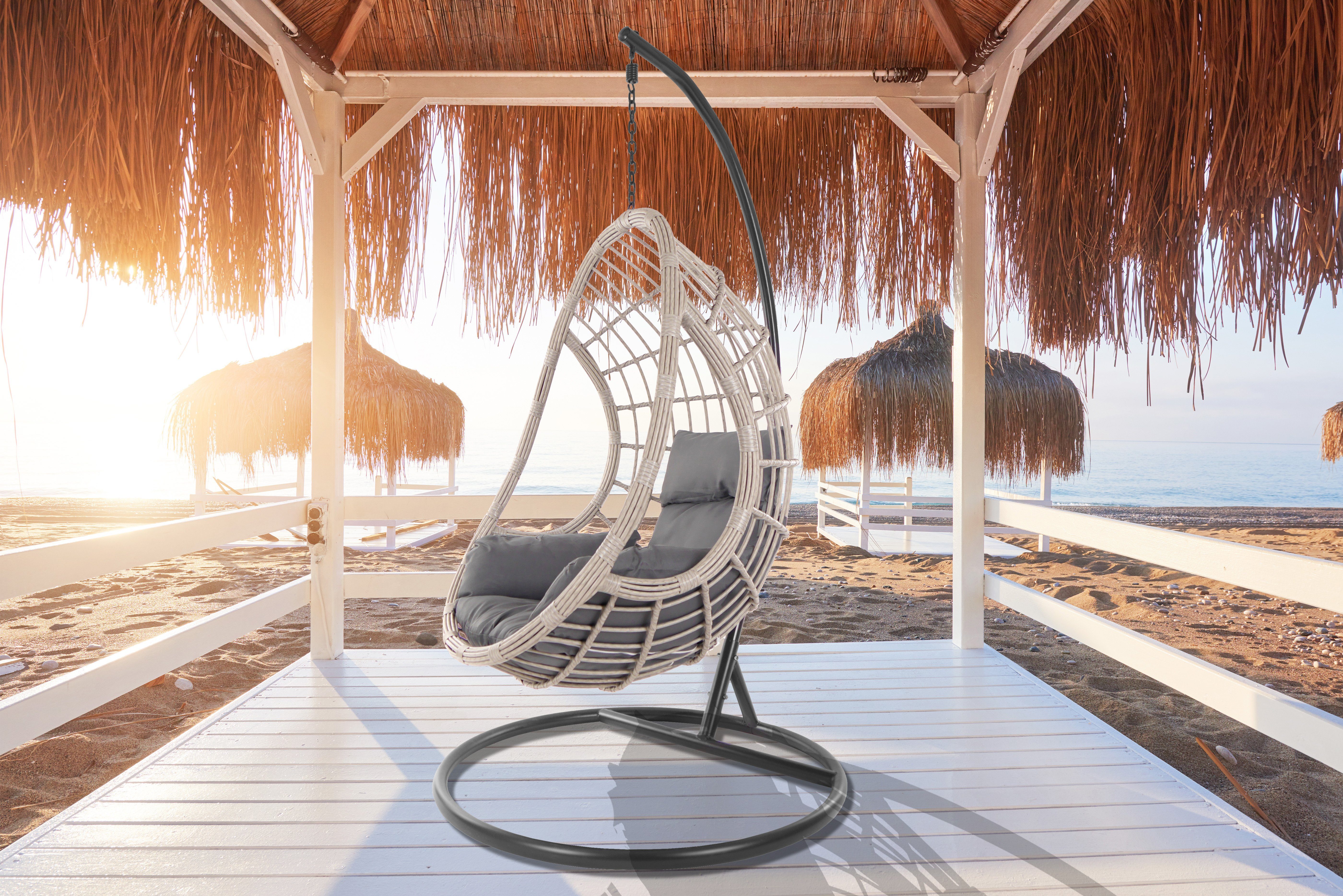 Einzigartig und schick, überzeugt der Swing Chair mit grauem Gestell und grau-beigem Korb in eleganter Wicklung. Ein hochwertiges und bequemes Kissen wird mitgeliefert. Der Hängesessel Palmanova ist ein modernes Möbelstück, das auch Freude beim Benutzen bereitet.