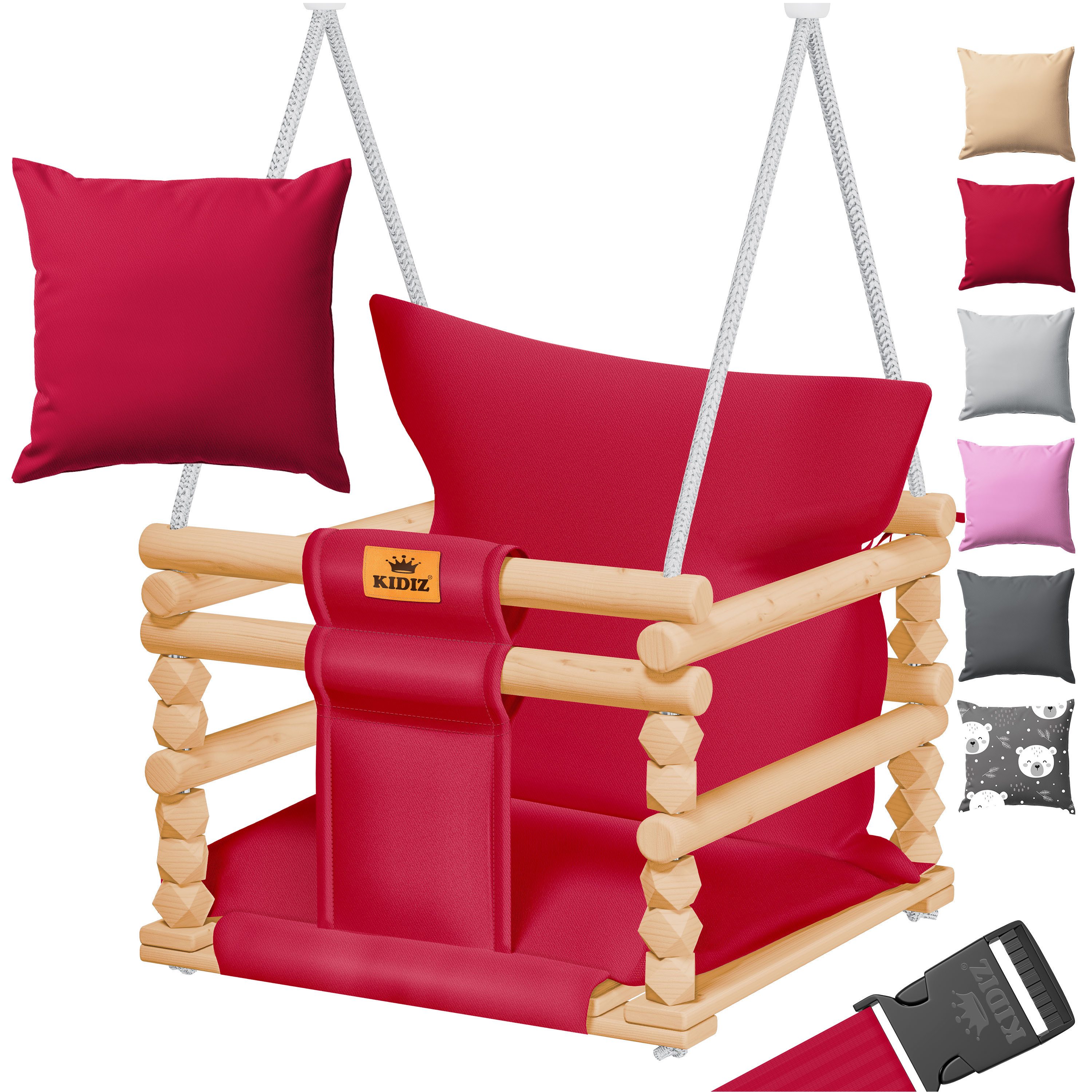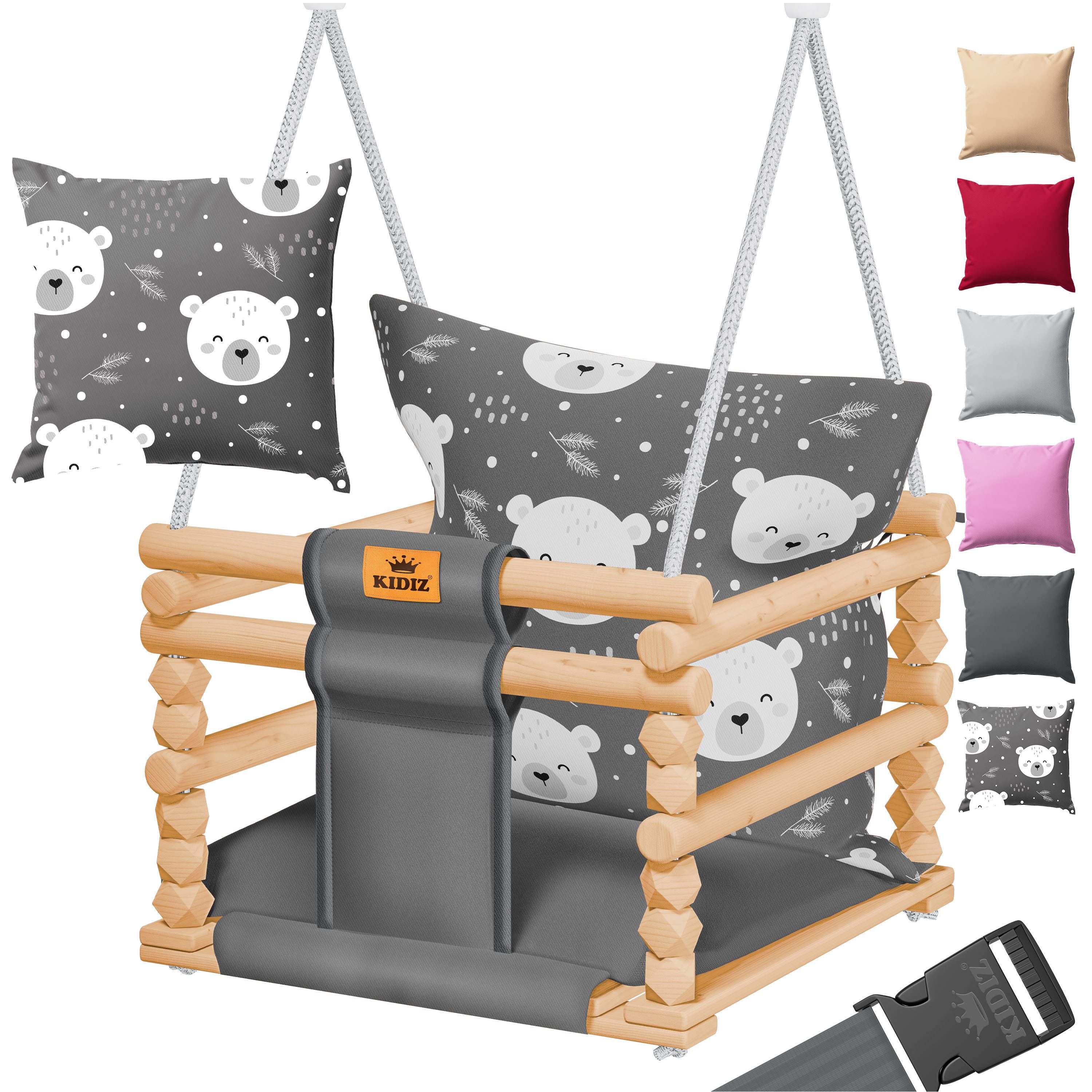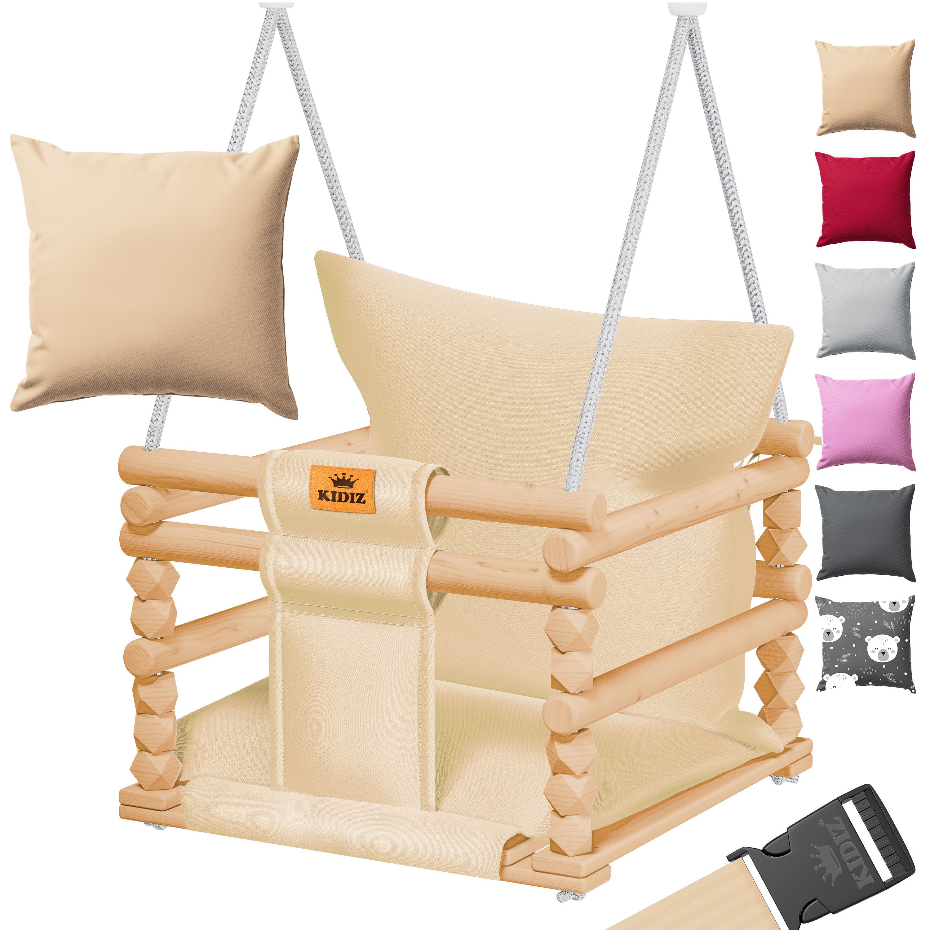 KIDIZ Babyholzschaukel zeichnet sich durch robuste Seilkonstruktion, sicheren Gurt, hochwertiges Holzdesign, abnehmbares Polsterkissen, flexible Höhenverstellbarkeit, Indoor & Outdoor Nutzung, Anti-Kipp-Design, atmungsaktiven Stoff und maximale Belastung von 60 kg aus
