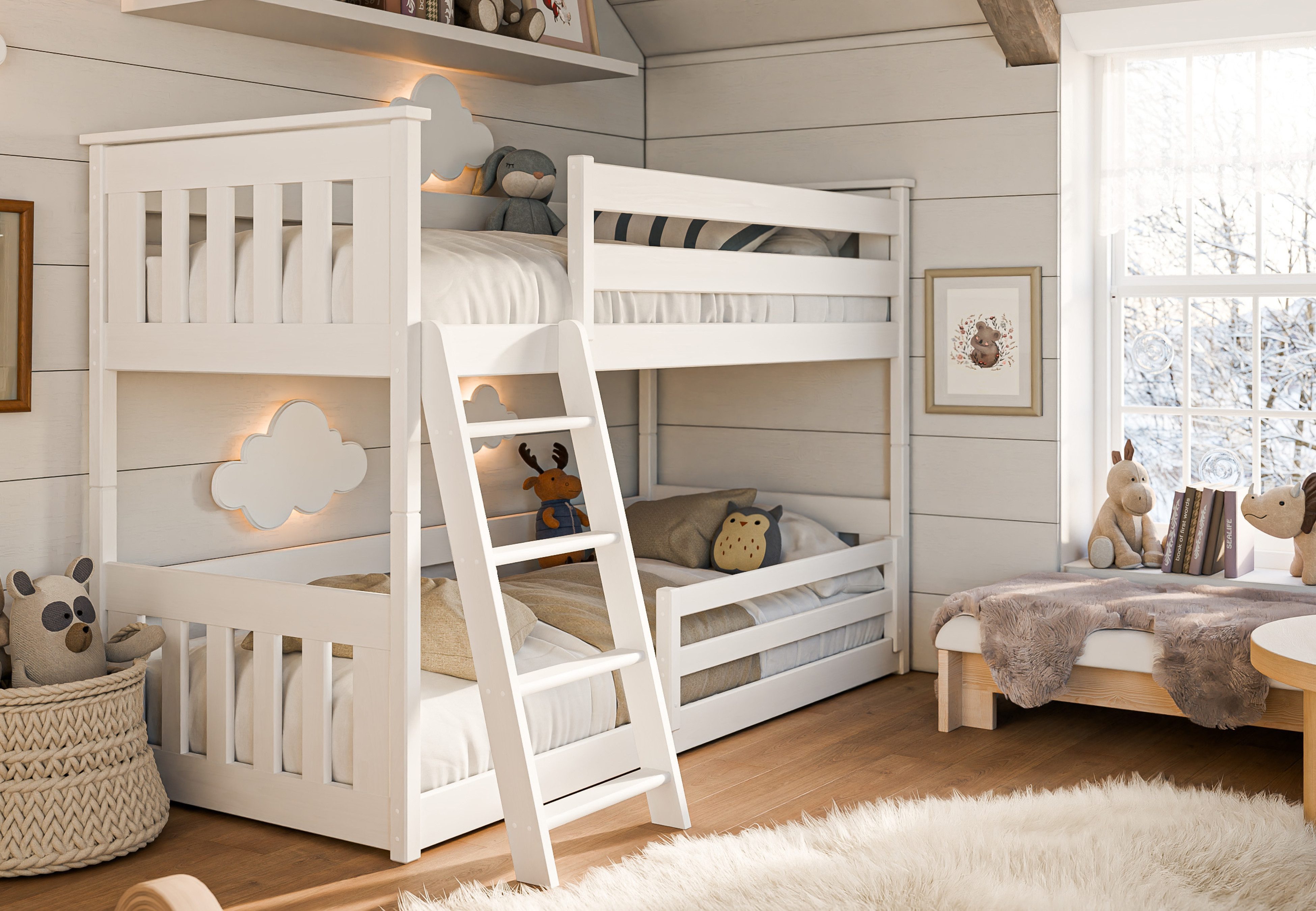 Hergestellt aus massivem Kiefernholz, ist das Etagenbett nicht nur zuverlässig und stabil, sondern strahlt auch mit seinem klassischen weißen Rahmen ein Gefühl von zeitloser Eleganz aus. Dieses Bett ist so konzipiert, dass es mehr als nur das Auge erfreut und bietet eine komfortable und sichere Schlafumgebung, die einen tiefen, erholsamen Schlaf für Ihr Kind fördert.