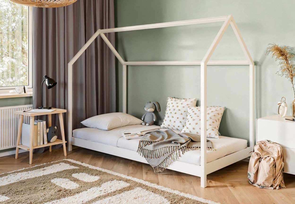 Das Kinderbett 90x200 cm mit Rausfallschutz & Lattenrost verwandelt das Schlafzimmer Ihrer Kinder in einen magischen Spielplatz. Mit seinem einzigartigen Hausdesign und der stabilen Konstruktion bietet dieses Bett nicht nur einen sicheren Schlafplatz, sondern auch eine kreative Spielumgebung. Die Dachkonstruktion ermöglicht es den Kindern, zusätzliche Dekorationen anzubringen und ihre Fantasie frei zu entfalten.