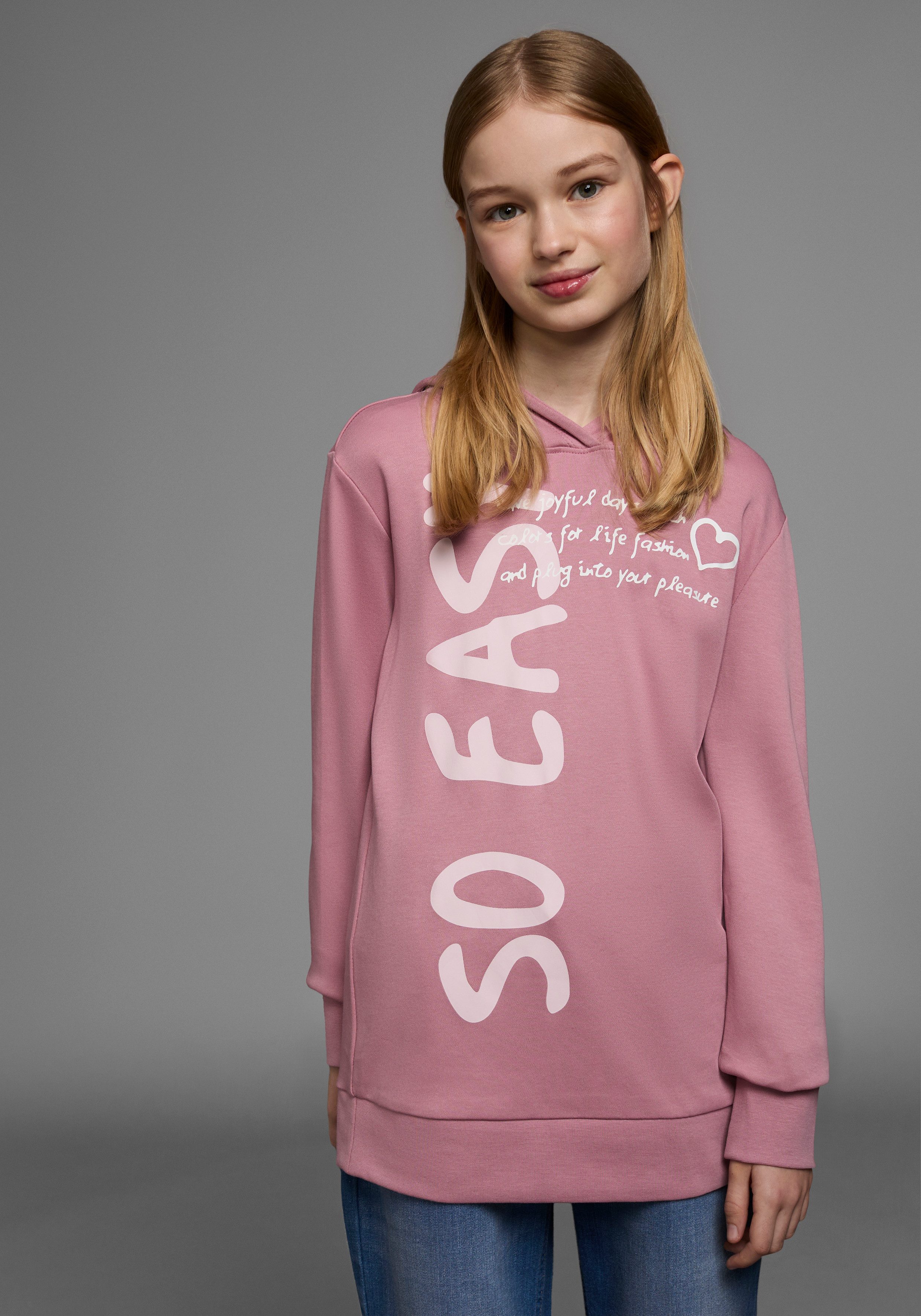 Probieren geht über kopieren: Mit diesem Kapuzenshirt »SO EASY - Print« von KIDSWORLD erfinden Teens ihren eigenen Style. Es wirkt mit dem Aufdruck trendig und ausgefallen. Die langen Ärmel enden in einem Bündchen. Es ist Po-bedeckend sowie basic geschnitten, sodass sich Teenies frei bewegen können.