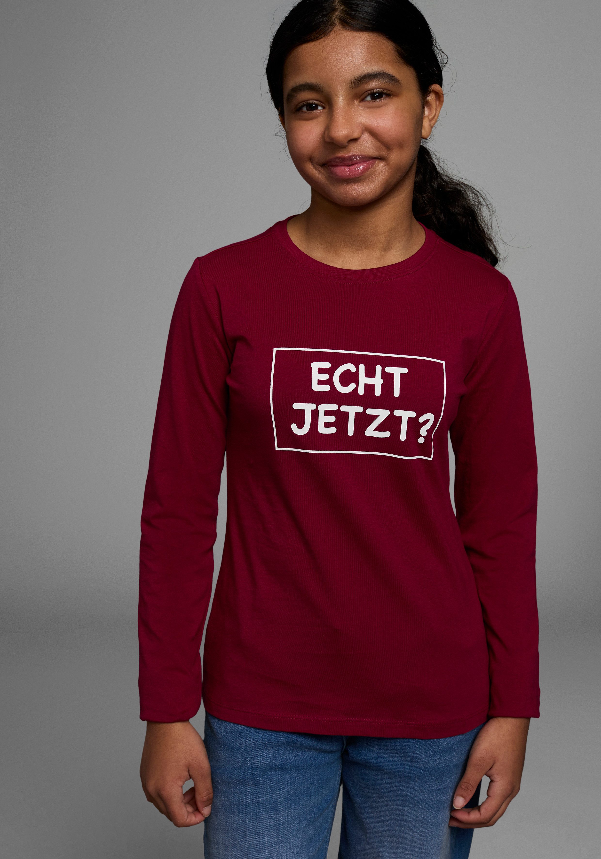 Das Langarmshirt »ECHT JETZT?« von KIDSWORLD ist ein stylisches Essential, um den persönlichen Stil zu finden. Mit dem Aufdruck sieht es peppig und dynamisch aus. Das Shirt hat einen Rundhalsausschnitt mit Rippbündchen und ist basic geschnitten, sodass sich Teenies frei bewegen können.