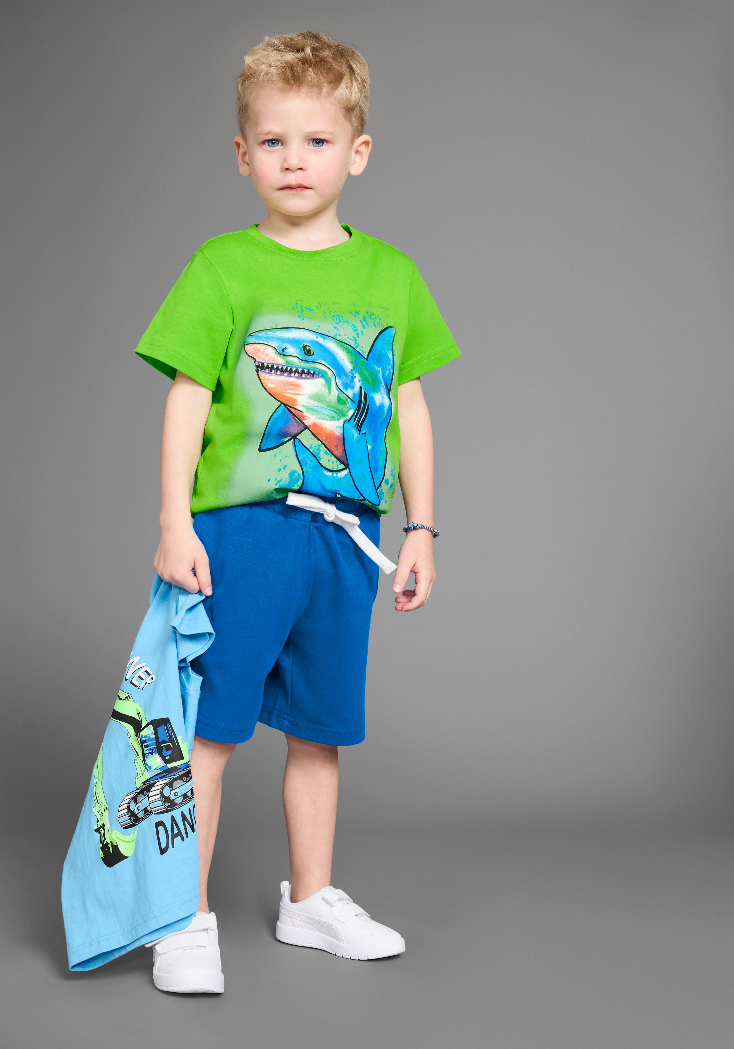 Mit diesem Set für Jungen von KIDSWORLD ist Wohlfühlen angesagt! Dieses Set für Jungen von KIDSWORLD ist wie gemacht für das neue Lieblings-Outfit drinnen und draußen! Es besteht aus 2 Basic-Teilen — einem T-Shirt und Sweatbermudas —, die zusammen eine hübsche Kombination ergeben. Der Aufdruck sorgt dabei für ein besonders schönes Aussehen. Die Kleidung besteht aus Single Jersey-Stoff, was sie bequem und pflegeleicht macht.