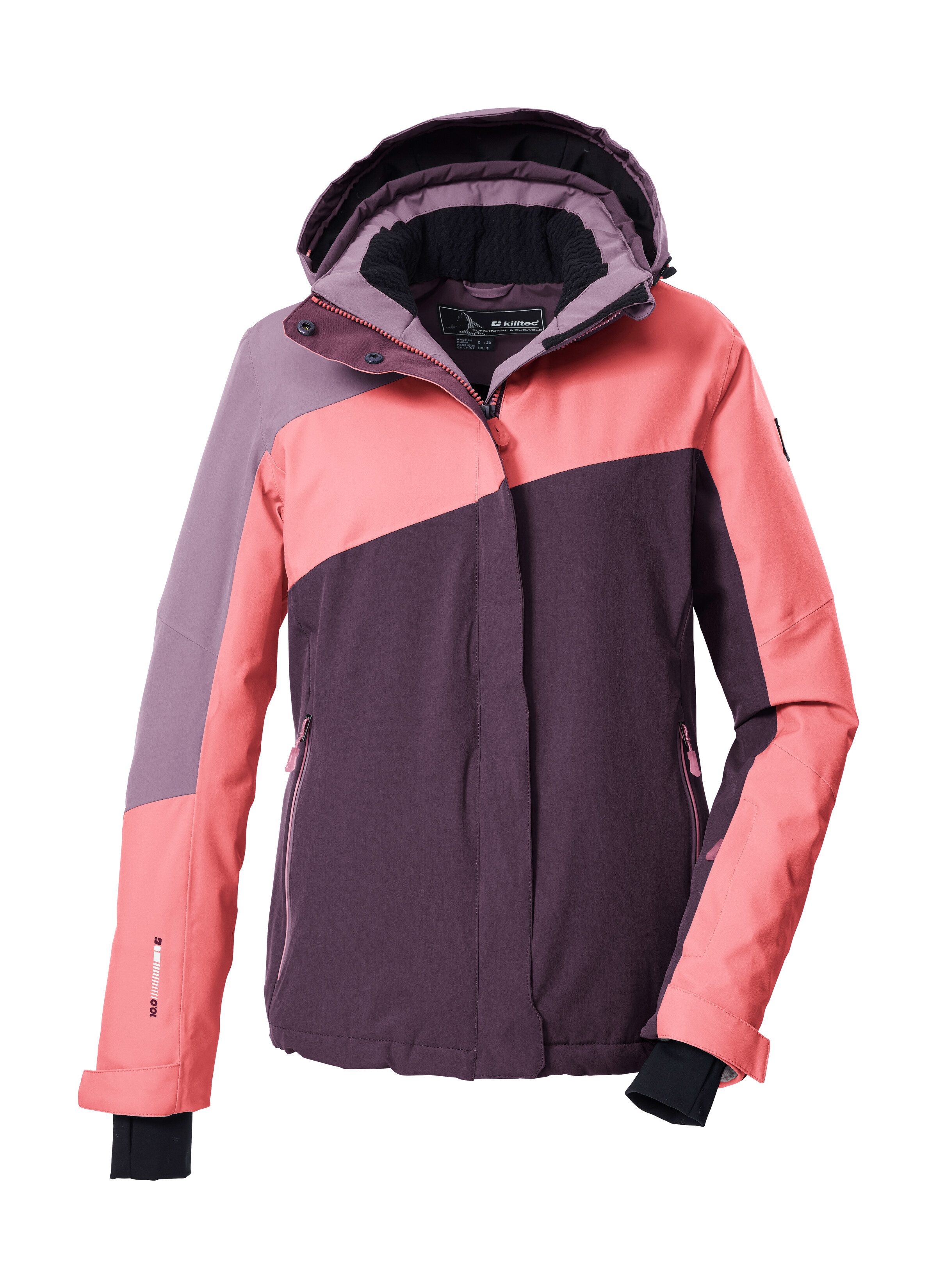Mit der Damen Skijacke von killtec im Colourblock Design sind dem Wintersportvergnügen keine Grenzen gesetzt. Mit verschweißten Nähten ausgestattet, ist die Jacke wind- und wasserdicht (10.000 mm, Tipp: ab und zu sollte die Jacke neu imprägniert werden). Gleichzeitig ist die Jacke atmungsaktiv mit einer Wasserdampfdurchlässigkeit von 3.000 g/m²/24 h. Die Skijacke ist mit einem rutschfesten, gummierten Schneefang sowie verstellbaren Ärmelabschlüssen mit Lycracuffs ausgestattet. Der verdeckte Reißverschluss ist mit einem Kinnschutz versehen. Zahlreiche Taschen bieten Platz für Skibrille, Skipass, Handy und Co. Die Weite der abnehmbaren Kapuze und des Saumes ist regulierbar. Diese Jacke wurde PFAs-frei imprägniert und teilweise aus recyceltem Material hergestellt.