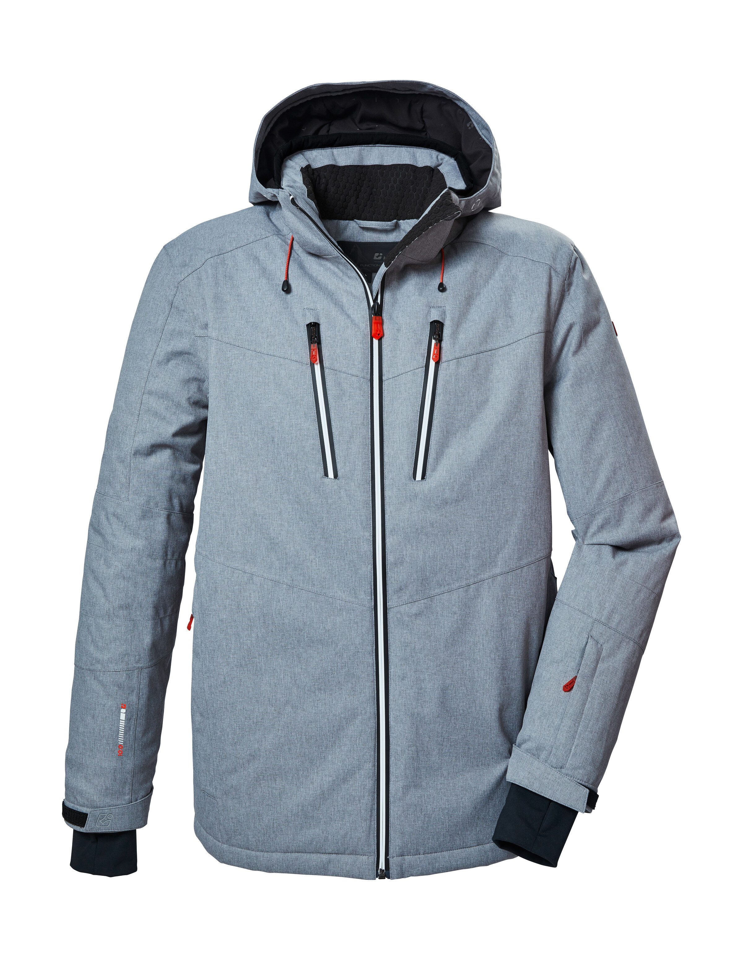 Die killtec Funktionsjacke mit Schneefang und in Melange Optik eignet sich bestens für die Skipiste, aber auch für alle anderen Outdoor-Aktivitäten. Die Skijacke ist atmungsaktiv mit einer Wasserdampfdurchlässigkeit von 3.000 g/m²/24h. Sie ist mit einer 10.000 mm Wassersäule und durch verschweißte Nähte wasserdicht (Tipp: ab und zu sollte die Jacke neu imprägniert werden). Die verstellbare Kapuze kann bei Bedarf abgenommen werden. Der rutschfeste Schneefang schützt vor dem Eindringen von Schnee und Nässe. An den verstellbaren Ärmelbündchen befinden sich bequeme Lycracuffs mit Daumenschlaufen. Der wasserdichte Reißverschluss ist mit einem praktischen Kinnschutz versehen. Die Weite des Saumes lässt sich durch einen Kordelzug regulieren. Diverse Taschen bieten Platz für Skibrille, Skipass und Co. Diese Jacke wurde mit fluorfreien Mitteln imprägniert.