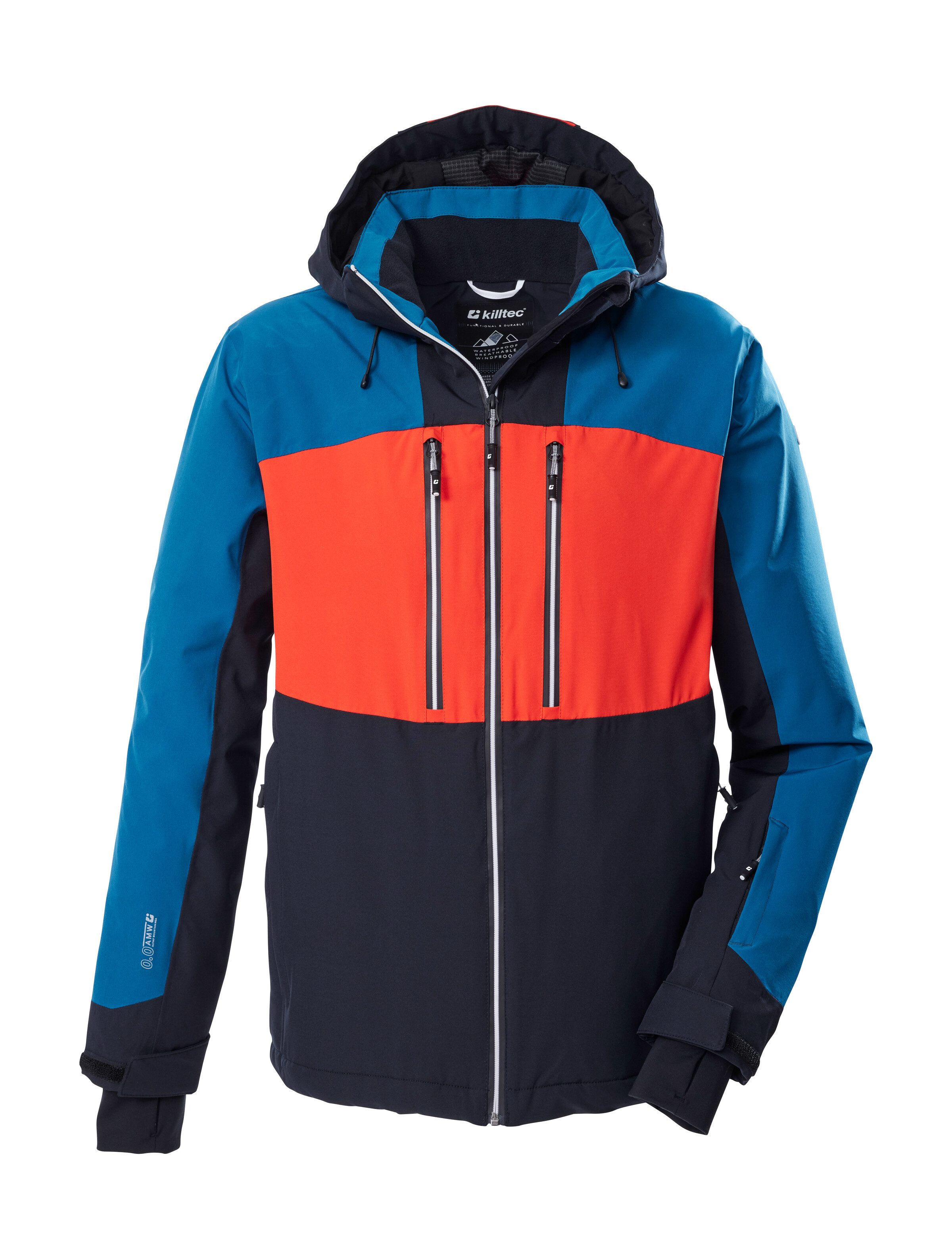 Die Herren Skijacke von killtec verbindet angesagtes Colourblock Design mit pistentauglichen Features. Sie ist durch die verschweißte Nähte und mit einer Wassersäule von 10.000 mm wind- und wasserdicht (Unser Tipp: ab und zu sollte die Jacke neu imprägniert werden). Gleichzeitig ist sie atmungsaktiv mit einer Wasserdampfdurchlässigkeit von 5.000 g/m²/24 h. Innen ist die Jacke mit einem rutschfesten Schneefang und zwei Innentaschen ausgestattet. Vier Zippertaschen außen und eine Skipasstasche bieten weiteren Stauraum. Die Weite der Kapuze und des Saumes lässt sich individuell regulieren, zudem lässt sich die Kapuze abzippen. Lycracuffs mit Daumenlöchern an den verstellbaren Ärmelabschlüssen verhindern das Eindringen von Kälte und Wind. Diese Jacke wurde PFAs-frei imprägniert.