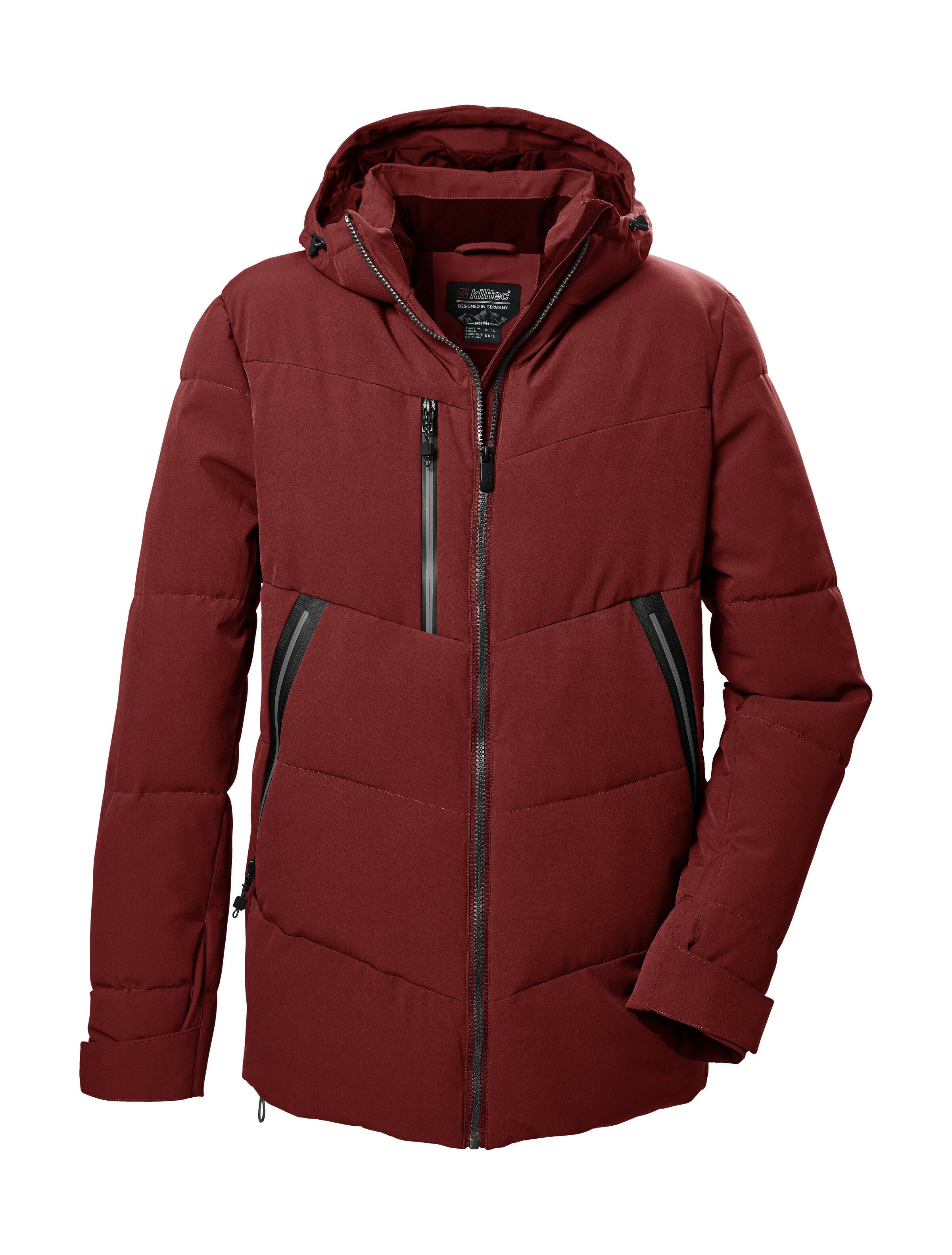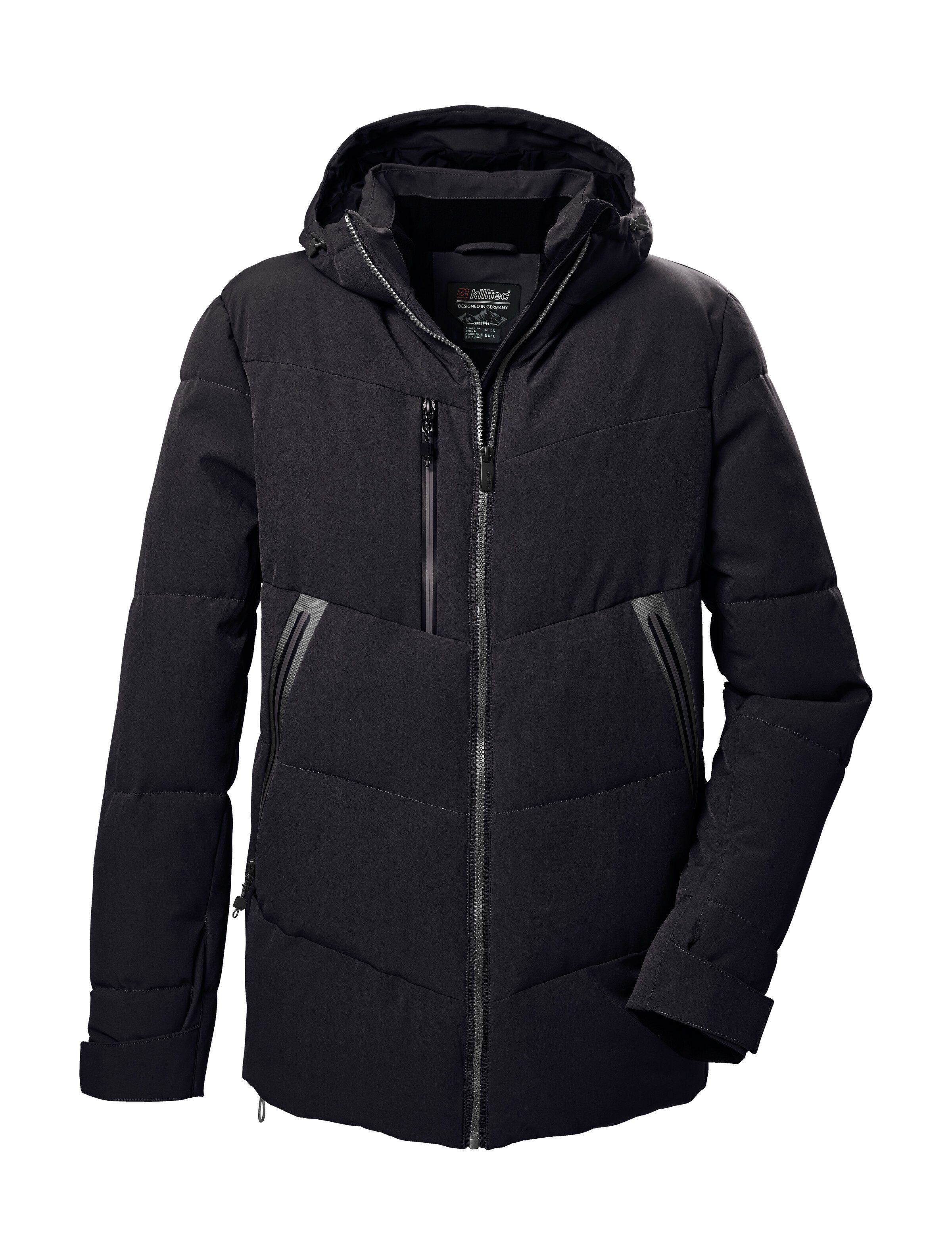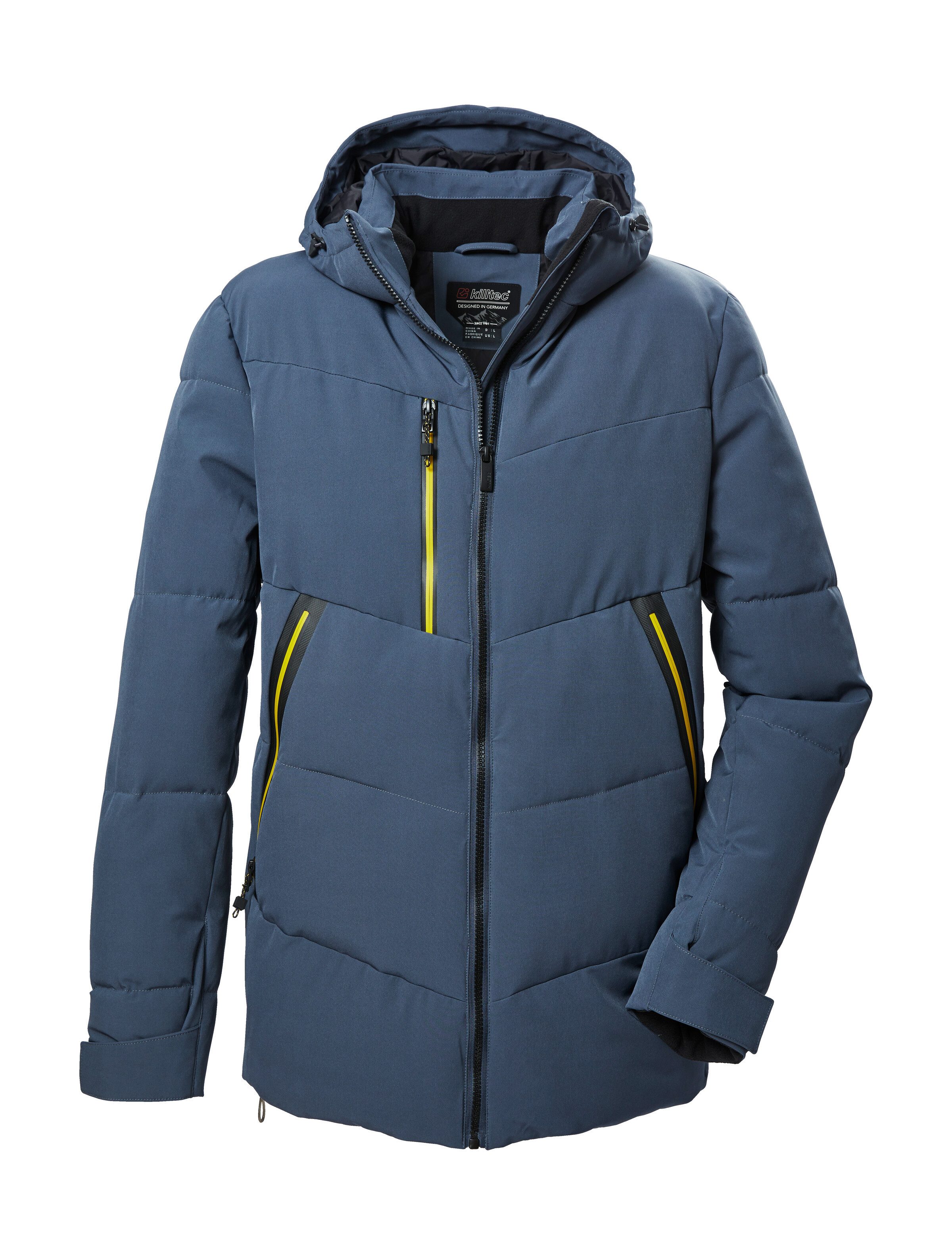 Die killtec Herren Funktionsjacke in Daunenoptik mit Kapuze ist ein absolutes Allroundtalent. Optisch besticht sie durch ihre besonders raffinierte Steppung und laminierte Zipper in Kontrastfarben. Die Jacke ist wasser- und windabweisend mit einer 10.000 mm Wassersäule und ist gleichzeitig atmungsaktiv. Die Ärmelbündchen lassen sich mit Klettverschlüssen verstellen. Die Kapuze und der Saum lassen sich regulieren. Zwei Seitentaschen, eine Brusttasche sowie eine Tasche innen bieten Stauraum für Handy, Schlüssel und Co. Diese Jacke wurde mit fluorfreien Mitteln imprägniert und wurde teilweise aus recyceltem Material hergestellt.