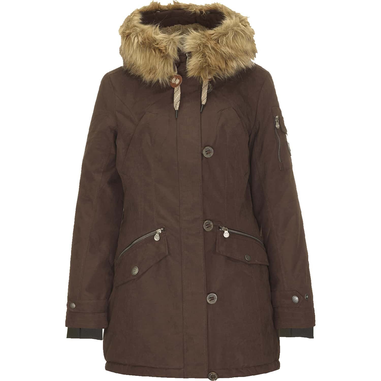 Atmungsaktivität 3.000 g/m²/24h. Wasserdicht, Wassersäule 8.000 mm, verschweißte Nähte. Femininer Schnitt mit Kapuze mit Kunstfellbesatz und Taillenkordelzug.