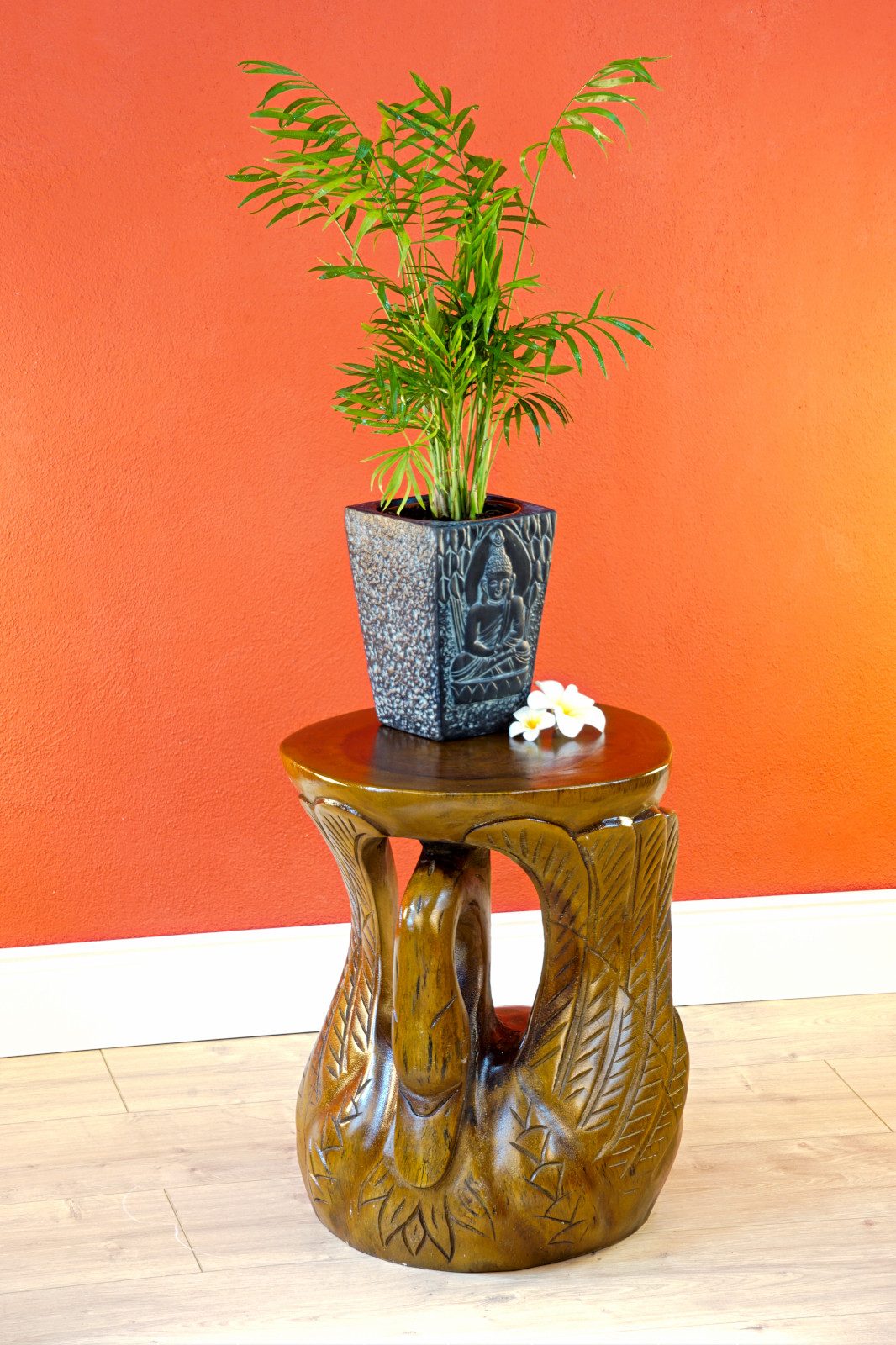 Tauchen Sie ein in die Welt der asiatischen Möbelkunst mit dem Holz Beistelltisch SORONG. Dieses außergewöhnliche Möbelstück verbindet Funktionalität mit kunstvoller Ästhetik. Handgefertigt aus robustem Massivholz (Akazie oder auch Suar Holz), besticht dieser Tisch durch sein elegantes Design in Form eines Schwanes, der eine runde Tischplatte auf seinen Flügeln und seinem Hals balanciert. Die detaillierten Schnitzereien des Federkleids verleihen dem Tisch eine faszinierende Tiefe und machen ihn zu einem Blickfang in jeder Einrichtung.