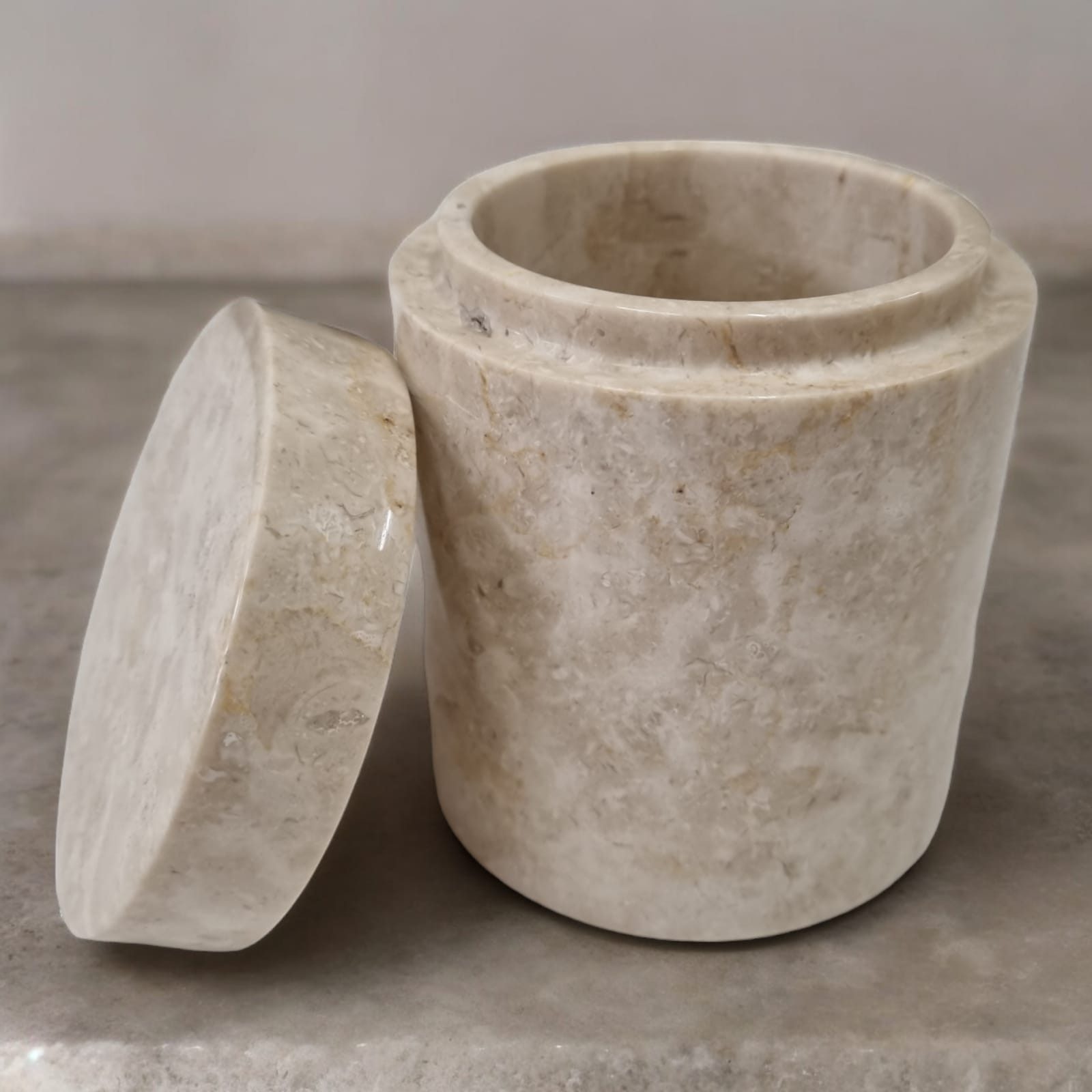 Mit kompakten Abmessungen von 6 x 5 cm ist diese Marmor Dose ideal für die Aufbewahrung kleinerer Gegenstände wie Schmuck, Münzen oder Gewürze. Der dazugehörige Deckel sorgt dafür, dass der Inhalt sicher und staubfrei bleibt, während die natürliche Schönheit des Marmors Ihre Einrichtung bereichert.