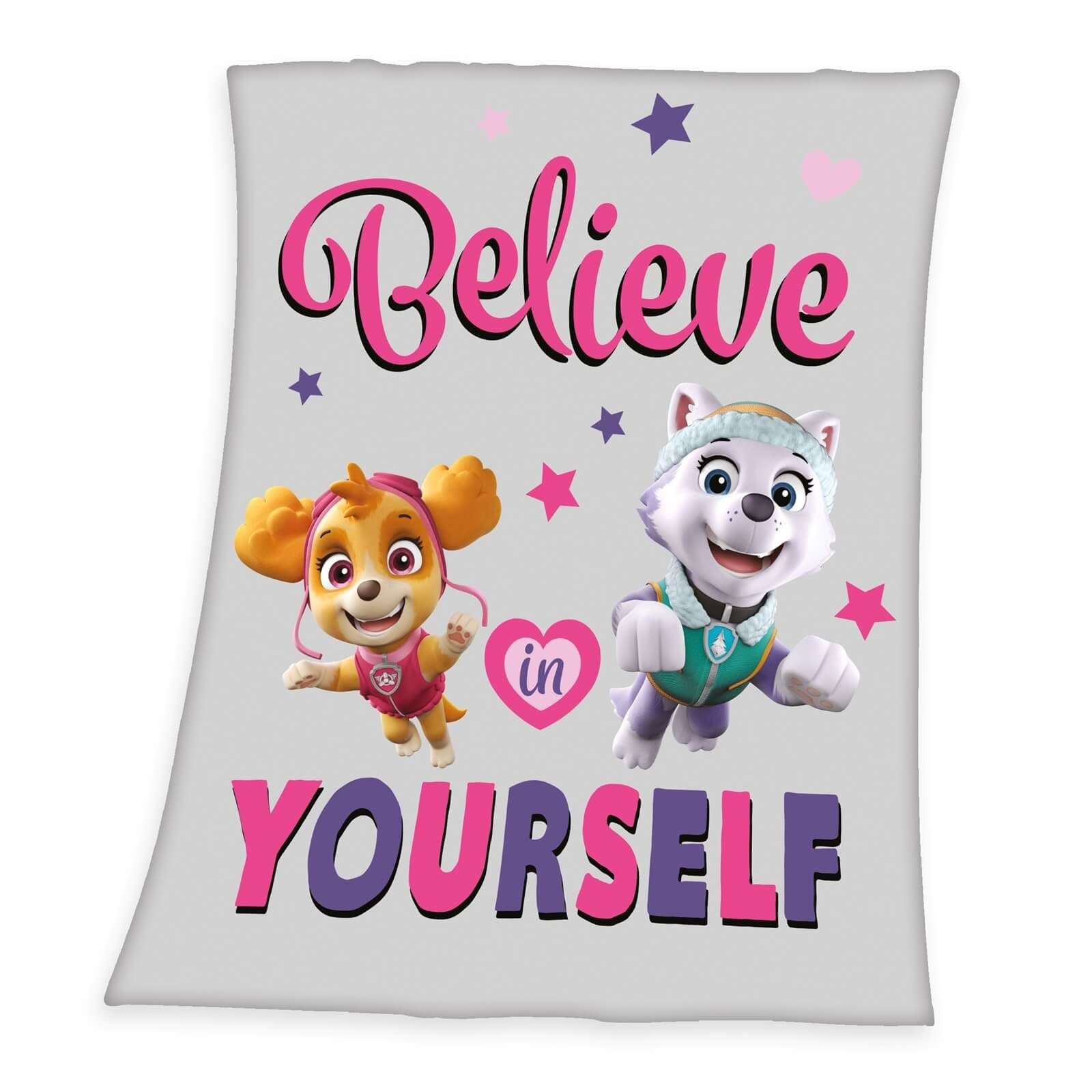 Die Vorderseite aus weichem Fleece ist mit einem PAW Patrol-Motiv und mit den Hundedamen Skye und Everest sowie kleinen Sternen und dem Schriftzug "Believe in yourself" bedruckt. Die Decke besteht aus 100% Polyester und lässt sich bei 40 Grad Normalwäsche leicht in der Maschine waschen. Die weiche und strapazierfähige Kuscheldecke kann im Frühling, Sommer, Herbst und Winter genutzt werden und bietet beste Voraussetzungen für ein sanftes Einkuscheln sowie eine äußerst komfortable und erholsame Nachtruhe.