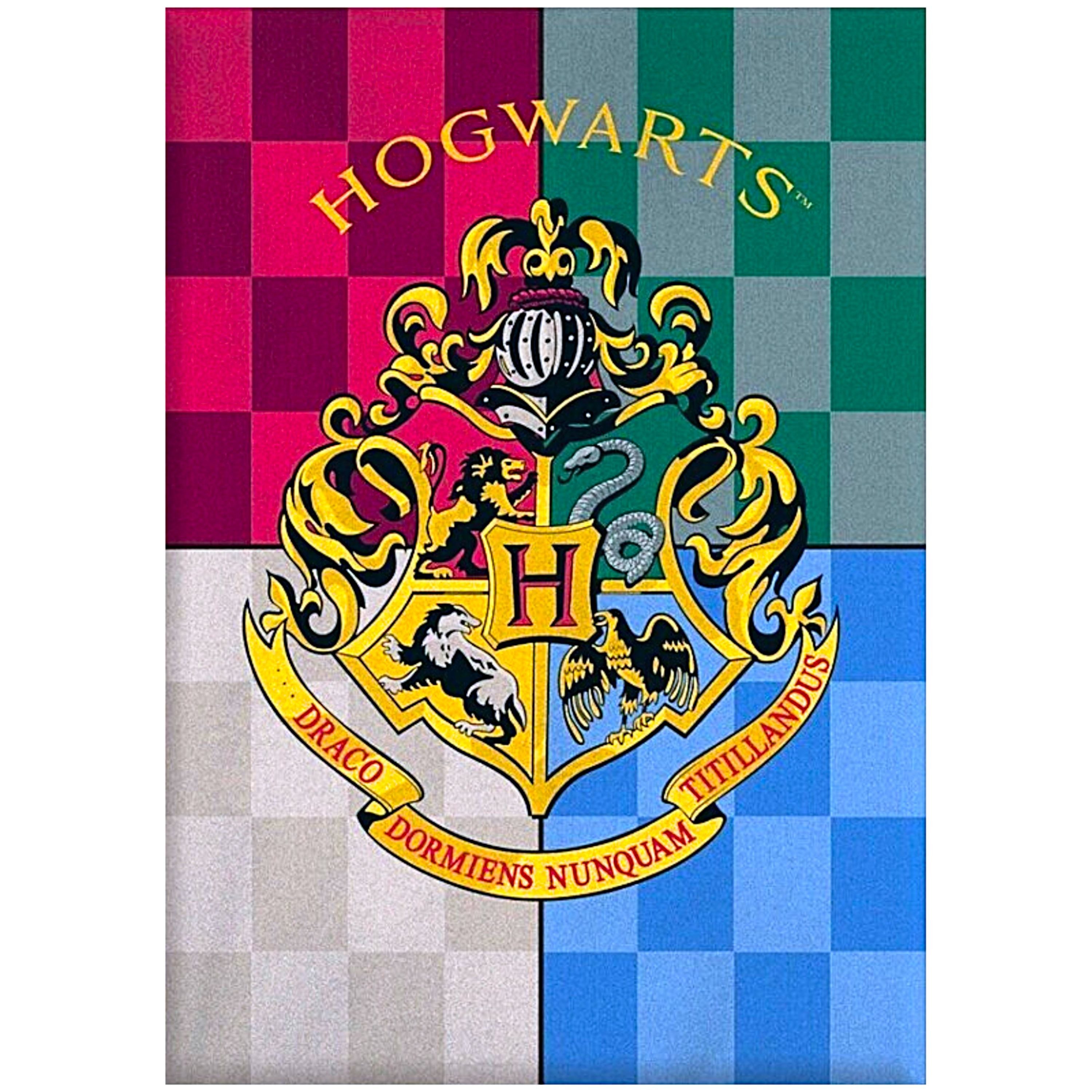 Der edle Druck zeigt das Wappen von Hogwarts, umgeben von den Farben der vier Häuser: Gryffindor, Slytherin, Hufflepuff und Ravenclaw. Die prächtigen Farben und die feinen Details bringen den Stolz auf die eigene Zugehörigkeit und die Magie von Hogwarts zum Ausdruck.