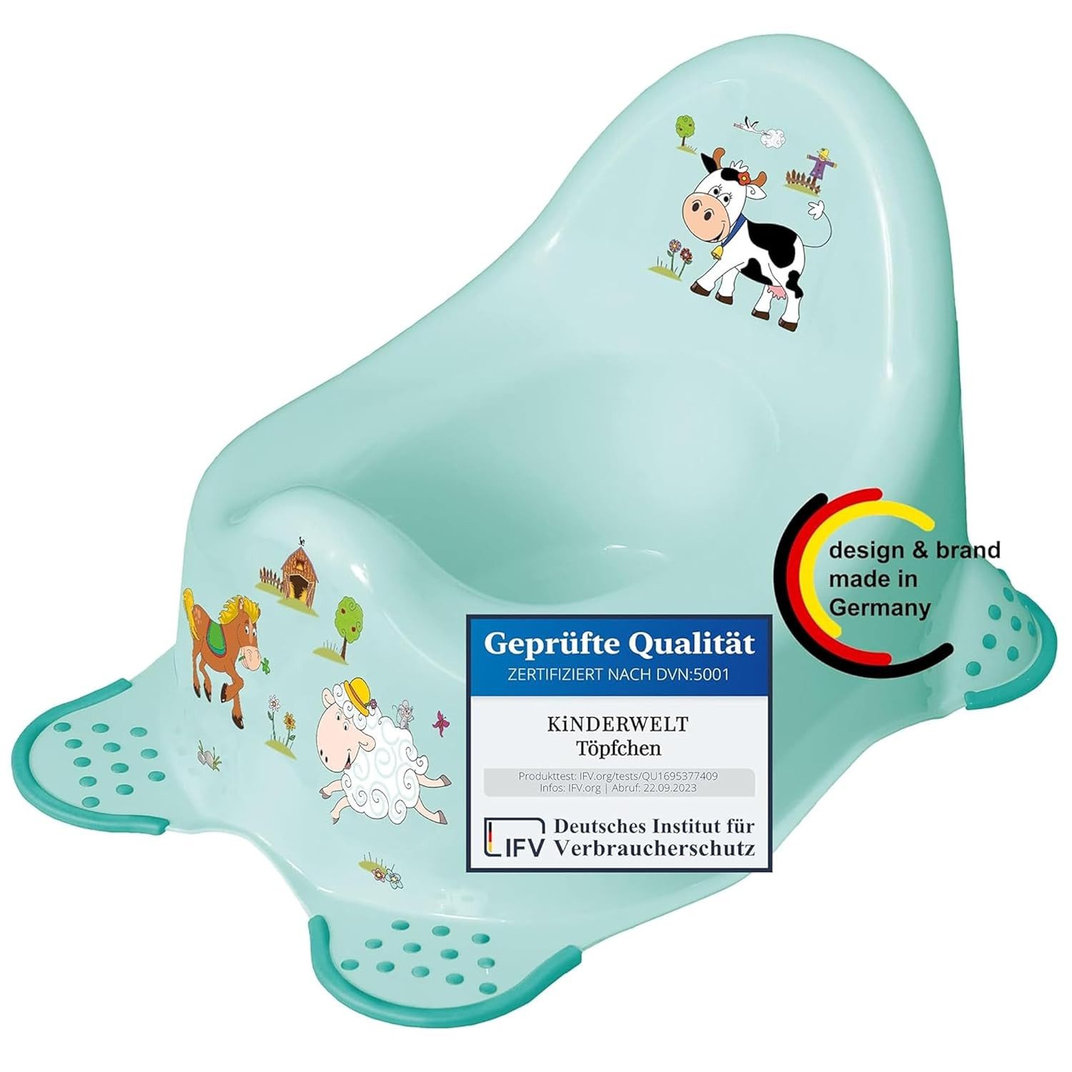 Dieses Qualitätsprodukt bietet eine ausgesprochen hohe Sicherheit für Kinder: die gummierten Füße bieten eine Anti-Rutsch-Funktion, die ein Kippen und Rutschen verhindern Hochwertiger, stabiler Kunststoff (PP/TPE), Frei von BPA und Weichmachern, gefragtes Funny Farm Design in der Farbe aquamarin, Dekor nicht abkratzbar, einfach zu reinigen, Maße (LxBxH): 38 x 27 x 23,5 cm, Gewicht: 372 g.
