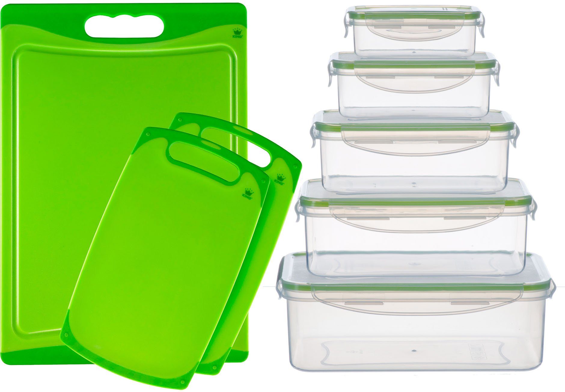 1x Box mit Deckel: 1000ml (ca. 12x18x5,5cm), 1x Box mit Deckel: 1500ml (ca. 14x20,5x6cm), 1x Box mit Deckel: 240ml (ca. 8x12x3,5cm), 1x Box mit Deckel: 2500ml (ca. 17x24x7,5cm), 1x Box mit Deckel: 500ml (ca. 10x15x4,5cm), 1x Schneidebrett 36x24.5x1cm, 2x Schneidebretter 25.5x15.5x0.8 cm