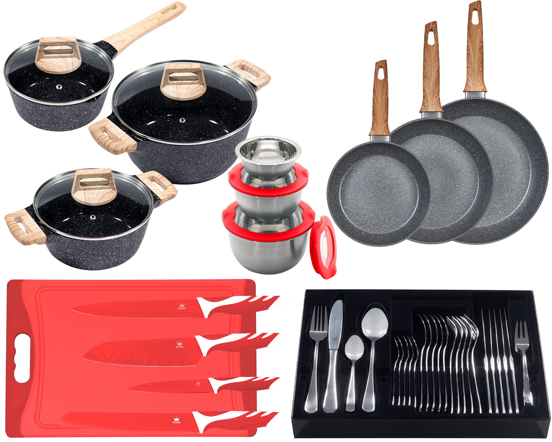Im Set ebenfalls enthalten: Drei Bratpfannen in unterschiedlichen Größen: Ø 20 cm (1 l), Ø 24 cm (1,6 l), Ø 28 cm - (2,4 l). Ausgestattet mit einer keramischen Antifhaft-Beschichtung und für alle Herdarten geeignet, auch für Induktion. Hitzebeständigkeit bis 160°C.