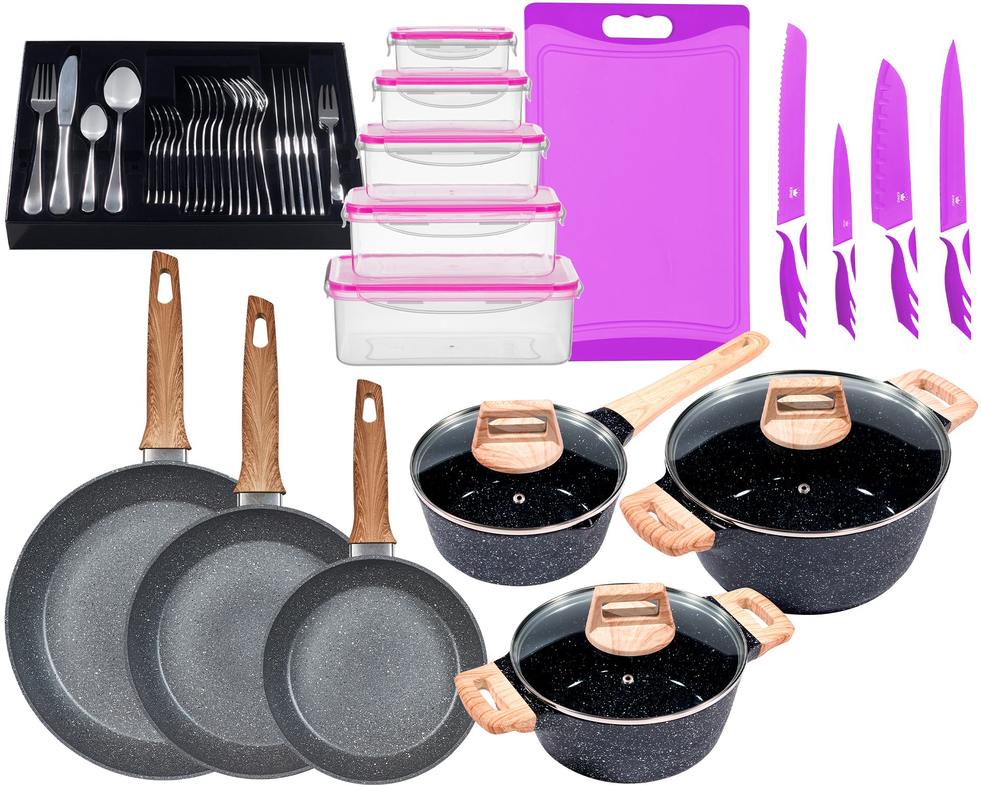 Im Set ebenfalls enthalten: Drei Bratpfannen in unterschiedlichen Größen: Ø 20 cm (1 l), Ø 24 cm (1,6 l), Ø 28 cm - (2,4 l). Ausgestattet mit einer keramischen Antifhaft-Beschichtung und für alle Herdarten geeignet, auch für Induktion. Hitzebeständigkeit bis 160°C.