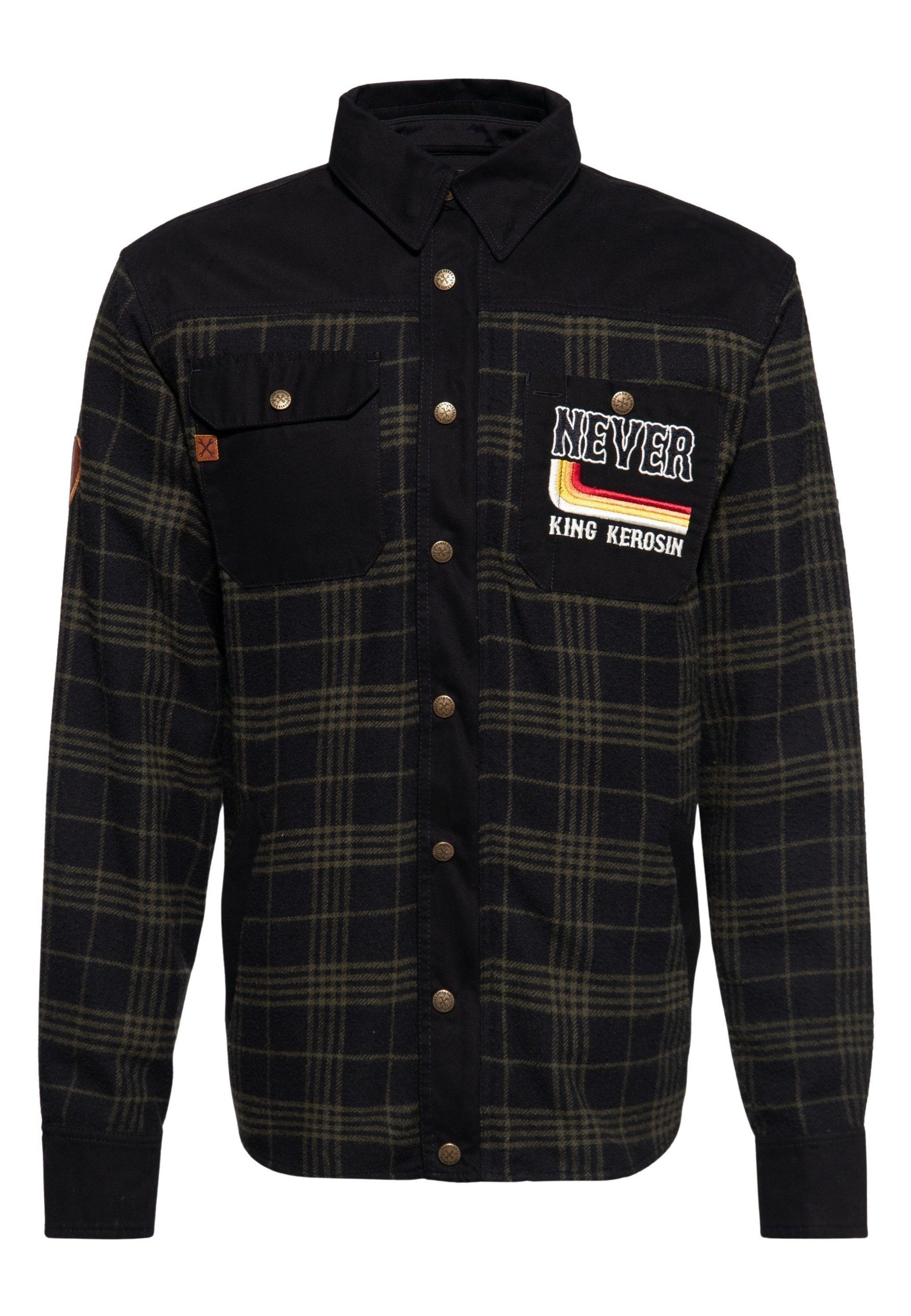 Die Statement-Stickerei im Rücken des King Kerosin Adventure Gear Funktionshemds verweist jeden sofort in klare Schranken, denn mit dir ist nicht zu spaßen! Optisch kann das Hemd mit seinem legeren Karomuster und den hochwertigen Stickereien überzeugen. Es verfügt über einen Kentkragen, lange Ärmel mit Manschetten und aufgesetzte Brusttaschen mit Patten. Für einen angenehmen Tragekomfort sorgt der hautfreundliche Flanell aus reiner Baumwolle und ein bequemer Straight Fit. Doch was macht das Hemd jetzt zu einem Funktionshemd? Ganz einfach! Mit dem separaten Innenfutter aus wasser- und windabweisendem Softshell Material kannst du dieses Hemd auch super einfach mittels einem Reißverschlusssystems zur Outdoorjacke aufrüsten. So kannst du das Hemd sowohl Innen, als auch mit einem der passenden Innenfutter der »Adventure Gear« Linie problemlos draußen tragen. Zum Motorradfahren lässt sich das Softshellfutter sogar mit einem kompatiblen Motorradfutter der »Motor Gear« (separat erhältlich) ersetzen. Oder wenn es mal richtig kalt sein sollte wäre das Fleece-Innenfutter (separat erhältlich) die perfekte Wahl. So kann dich nichts mehr aufhalten. Ein weiterer Pluspunkt sind die Eingrifftaschen, die genau wie die Front und die Ärmelschlitze mit Reißverschlüssen versehen sind.