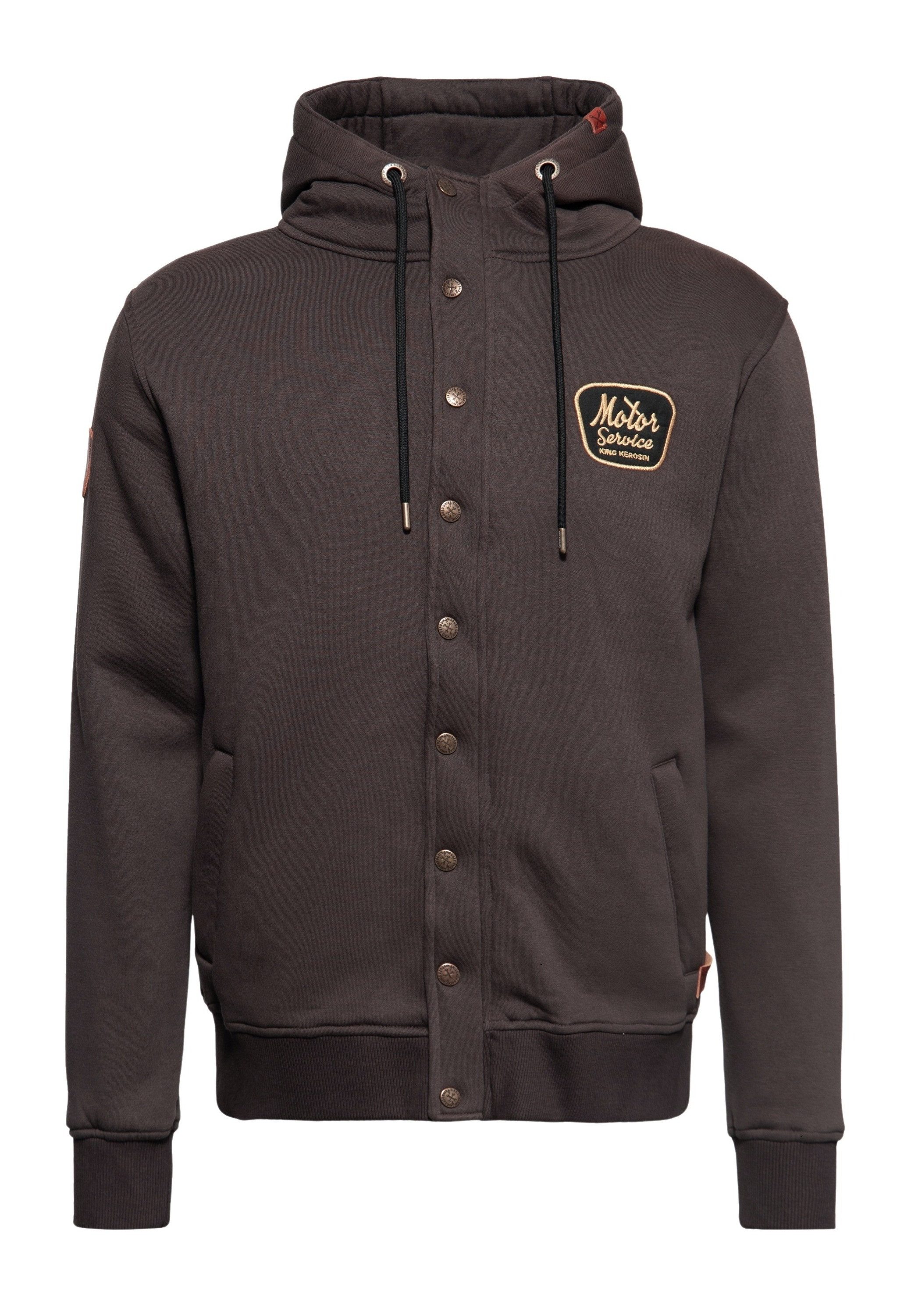 Eine Sweatjacke die mehr kann als nur stylisch aussehen? King Kerosin präsentiert seine Funktionssweatjacke mit authentischem Retro-Vibe! Sie besteht aus einer hautfreundlichen Sweatware und ist in einem bequemen Comfort Fit geschnitten. Sie verfügt über eine Kapuze mit Kordelzug und Eingrifftaschen mit Reißverschluss. Coole Lederpatches und hochwertige Stickereien im Vintage-Design vervollständigen zusammen mit den Rippbündchen an Saum und an den Ärmeln den legeren Casual-Look. Geschlossen wird die Jacke mit einem verdeckten Reißverschluss und Druckknöpfen in der Front.