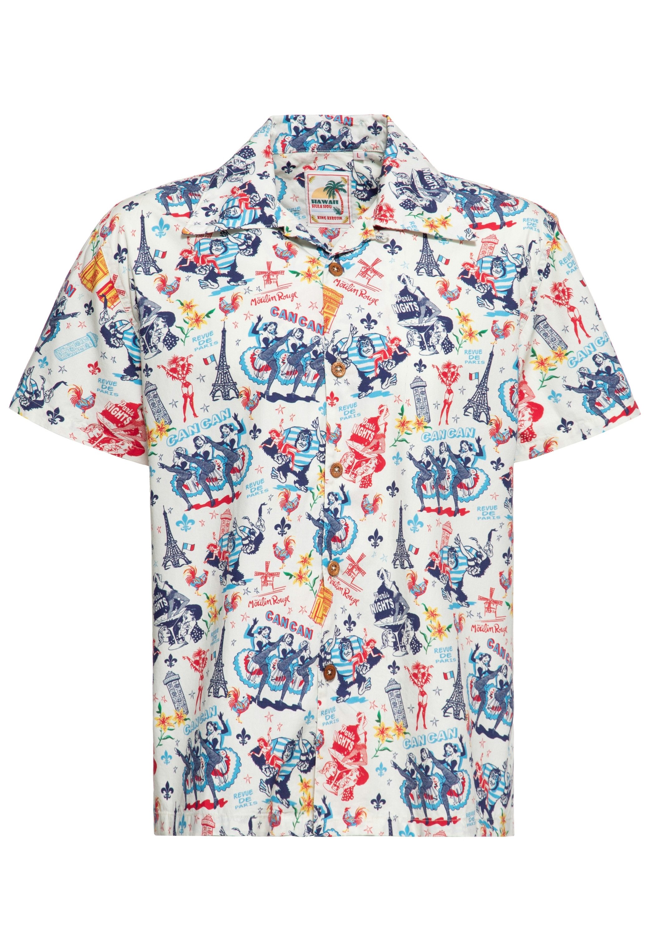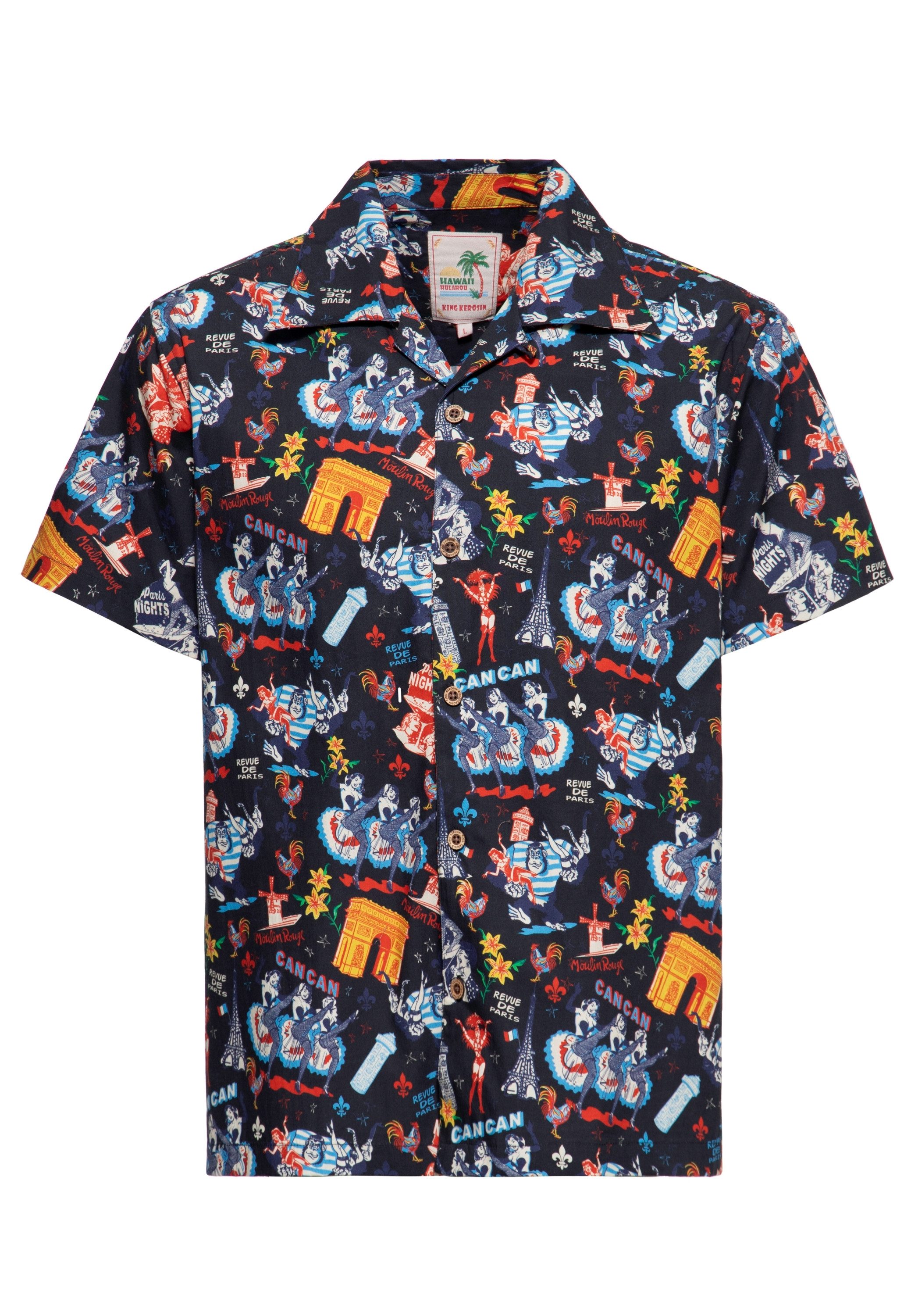 Tauche ein in das charmante Pariser Flair mit dem Hawaii-Hemd von King Kerosin. Dieses lebendige Hemd zelebriert die ikonischen Wahrzeichen und den unwiderstehlichen Charme von Paris, perfekt verpackt in einem kunstvollen Design, das sowohl stilvoll als auch augenzwinkernd ist. Aus nachhaltiger Biobaumwolle hergestellt und in einer GOTS-zertifizierten Produktionsstätte produziert, bietet dieses Hemd mit seinem Regular Fit hohen Tragekomfort und bleibt dabei umweltbewusst. Der Reverskragen und die Knöpfe aus Holz runden das Vintage-Gefühl ab. Auf dem Hemd prangen der majestätische Eiffelturm und der triumphale Arc de Triomphe, umgeben von den verführerischen Tänzerinnen des Moulin Rouge. Hinzu kommt ein gigantischer Affe, – nennen wir ihn einfach „Monsieur Grand“ der spielerisch zwei Tänzerinnen in eine Szene voller Pariser Eleganz entführt. Dieses kreative Zusammenspiel von Symbolen macht das Hemd zu einem echten Blickfang. Ob du durch die Boulevards von Paris schlenderst oder einfach den Alltag mit einem Hauch von Kultur würzen möchtest, das kurzärmelige Hawaiihemd bringt französischen Charme und künstlerische Freiheit in jede Situation. Lass dich von diesem Hemd inspirieren und zeige deine Liebe für die Stadt der Kunst und der Liebe auf die verspielteste Art und Weise.