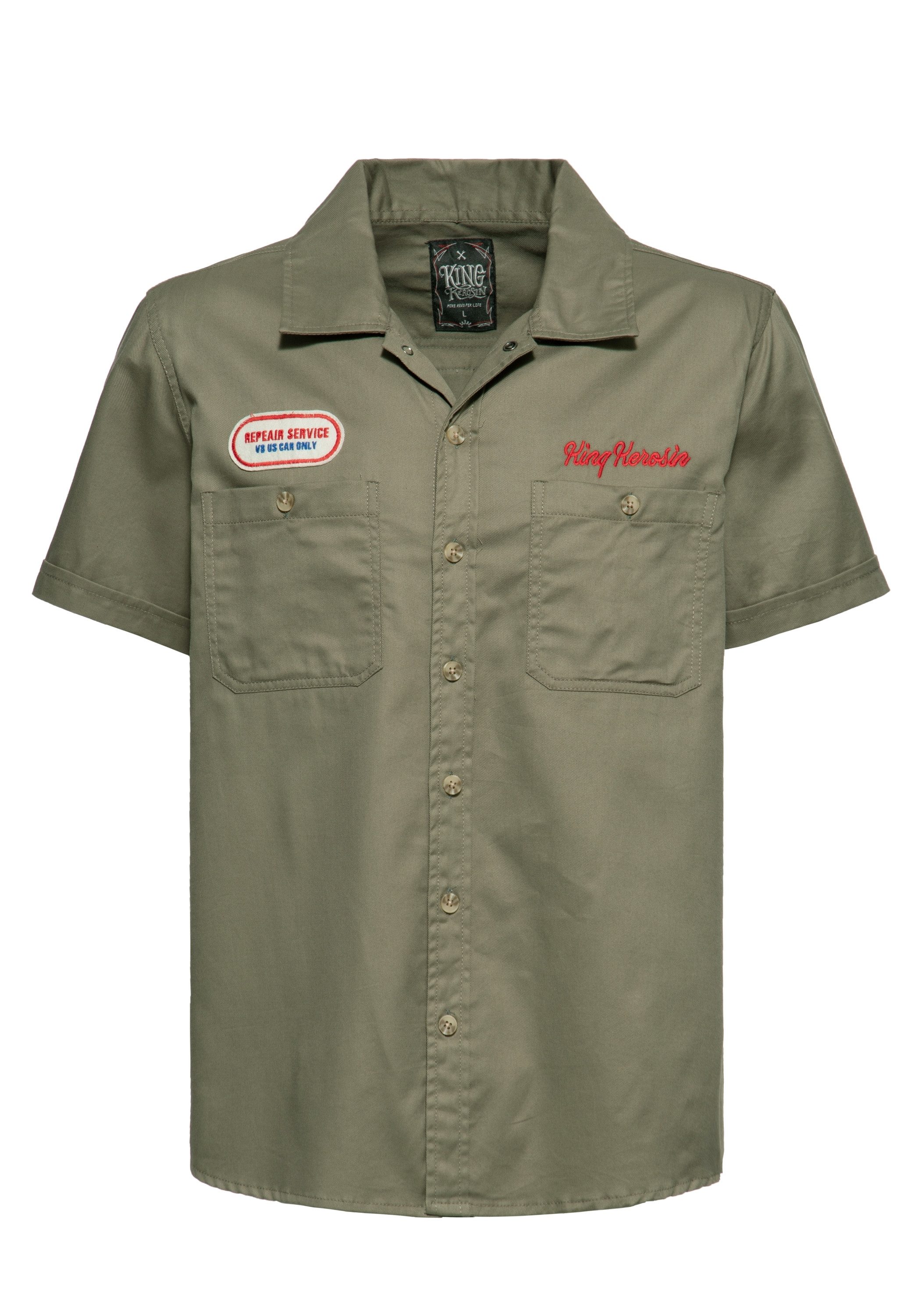 Das King Kerosin Workwear-Hemd verkörpert den robusten Charme klassischer Arbeitskleidung und ist ideal für Liebhaber des Retro-Looks und der amerikanischen Speed-Kultur. Der dominierende „Redondo Beach Speed Kings“ Patch auf der Rückseite ist ein auffälliges Merkmal, das die dynamische Speed-Szene von Los Angeles feiert. Dieser große Patch zieht sofort die Blicke auf sich und verleiht dem Hemd eine unverwechselbare Note. Das Hemd ist vollständig einfarbig gehalten, was ihm einen klaren und schnörkellosen Stil verleiht. Auf der Vorderseite prangt ein Aufnäher auf der einen Brustseite, während die andere Seite mit einer eleganten King Kerosin Stickerei versehen ist, die die Marke und deren Erbe repräsentiert. Mit seinem Material aus reiner Baumwolle bietet dieses Kurzarm-Hemd nicht nur hohen Tragekomfort, sondern auch eine hervorragende Atmungsaktivität, ideal für lange Arbeitstage oder Freizeitaktivitäten. Der Regular Fit sorgt für eine bequeme Passform, die nicht zu eng anliegt. Der flach liegende Reverskragen rundet das klassische Erscheinungsbild ab. Zwei aufgesetzte Brusttaschen mit Knopf und die kurzen Ärmel mit fixiertem Umschlag bieten zusätzliche Funktionalität und einen Hauch von Stil. Der erste Knopf am Kragen ist ein Druckknopf, während die restlichen Knöpfe normale sind. Dieses Workwear-Hemd verbindet traditionellen Arbeitskleidungsstil mit der Energie und dem Flair der Speed-Kultur, wodurch es sowohl praktisch als auch modisch ist.