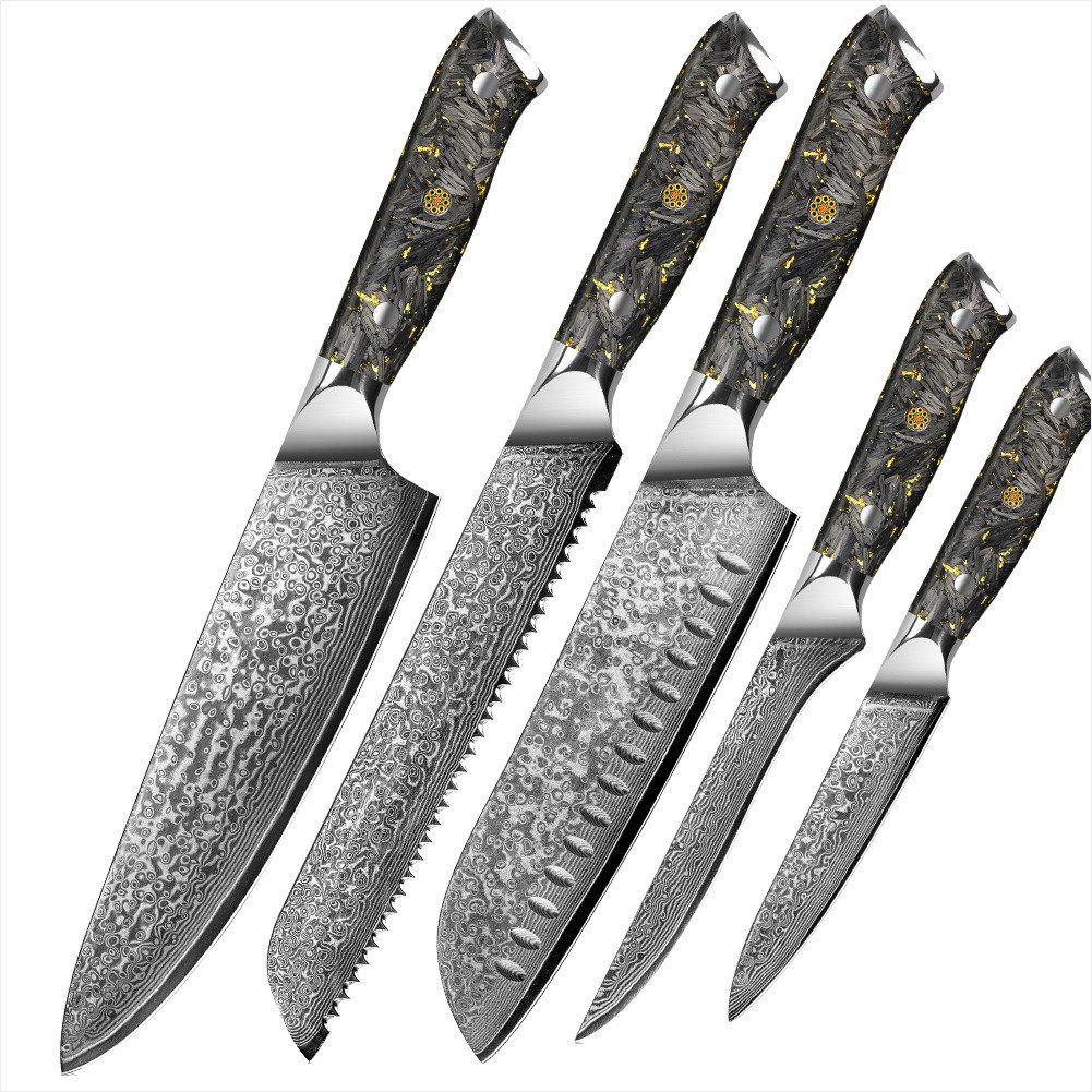 Der Griff jedes Messers besteht aus einer Kombination aus Harz, zerkleinertem Kohlenstoff und Blattgold, was nicht nur für eine elegante Optik sorgt, sondern auch für eine optimale Balance und Griffigkeit beim Schneiden.