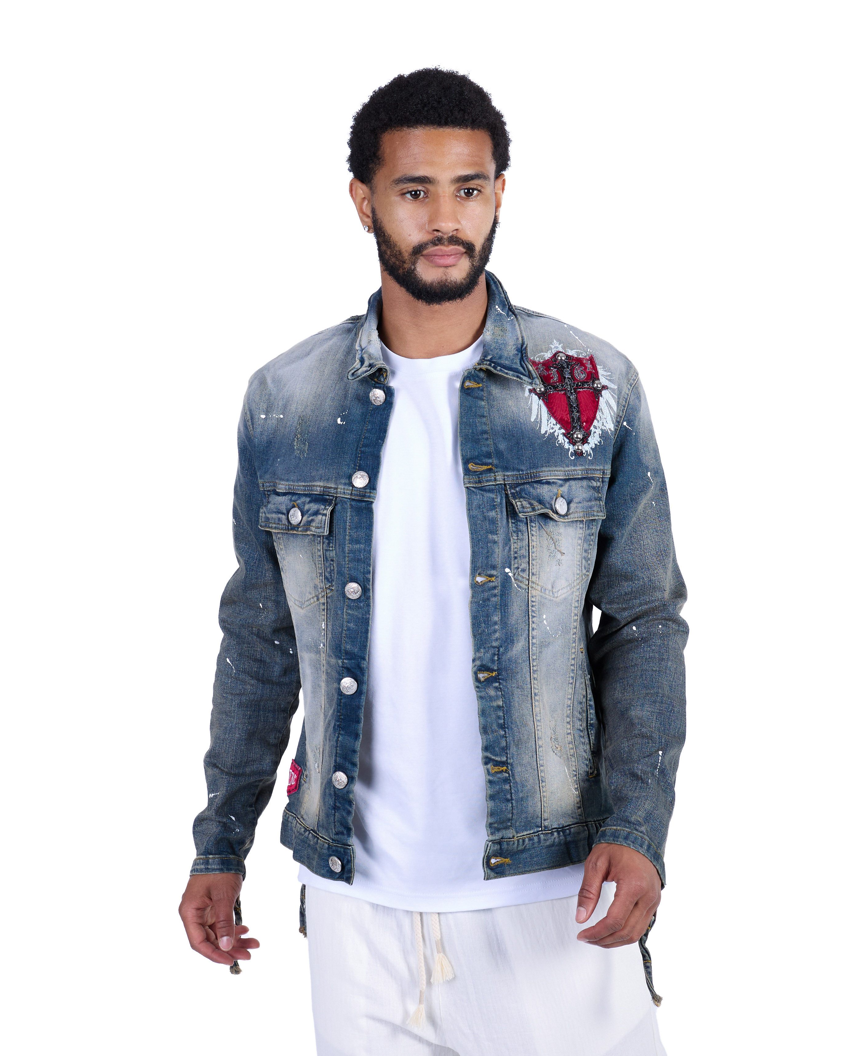Designer Jeansjacke Stone Washed mit Farbeffekten & Kruzifix-Details