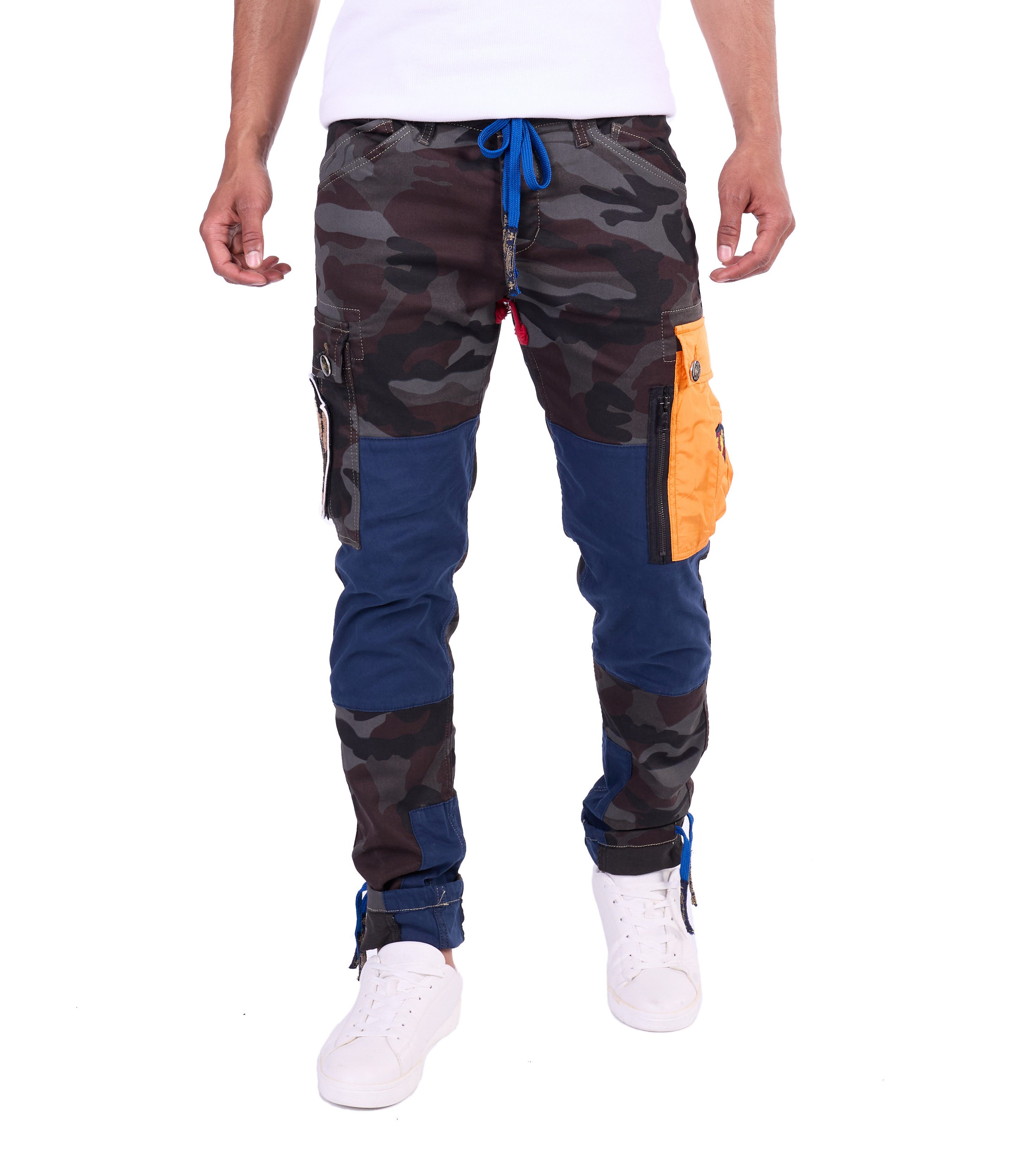 Die Highlights dieser Hose sind ihre ausgeklügelten Details: Die linke Cargotasche in auffälligem Orange bildet einen spannenden Kontrast zur rechten Cargotasche im klassischen Camouflage-Muster, beide verziert mit aufgesetzten Patches. Im Gesäßbereich findest du einen praktischen Patch mit Klettverschluss, der sich leicht abnehmen lässt und dir individuelle Styling-Optionen bietet. Der Knie- und Gesäßbereich ist mit blauem Stoff kontrastreich abgesetzt, was der Hose einen modernen Touch verleiht. Ein weiteres cooles Detail sind die Gesäß-Klapptaschen, die mit Totenkopfknöpfen verziert sind. Die Hosenbeinenden sind mit Schnüren zum Verstellen des Bundes versehen, sodass du die Weite individuell anpassen kannst. Der Verschluss erfolgt über eine klassische Knopfleiste, zusätzlich gesichert mit einem Tunnelzug für optimalen Halt.