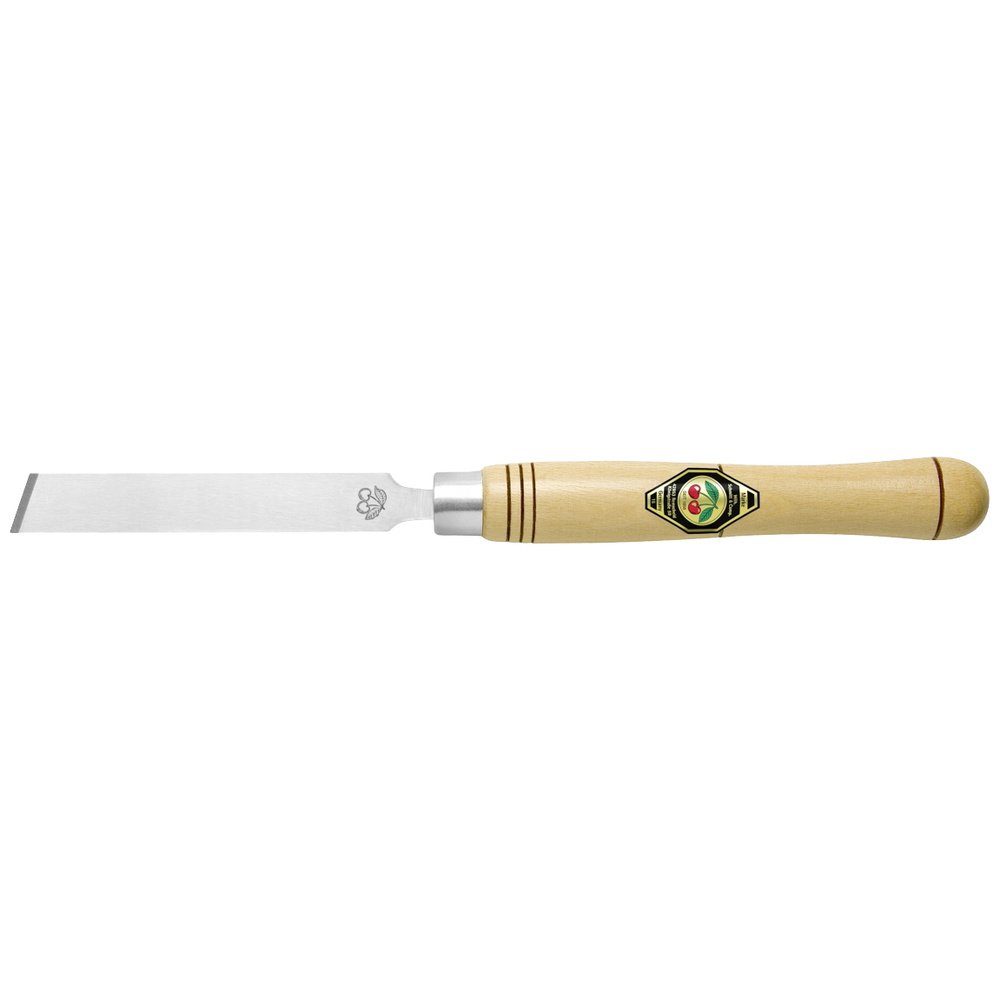 Flachmeißel schräg, zweiballig, mit langem Weißbuchenheft, nach A DIN 5144. Die »KIRSCHEN« Drechselbeitel werden aus Spezial-Werkzeugstahl mit hohem Kohlenstoffanteil hergestellt. Sie liegen mit einer Härte von HRc 61 über die gesamte Nutzlänge der Klinge weit über der DIN. Die Heftlänge bei diesen Werkzeugen beträgt 300 mm