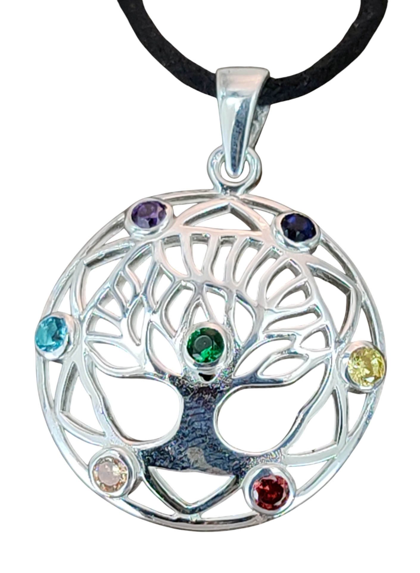 Kunstvoll gestaKunstvoll gestalteter Yggdrasil-Anhänger aus 925 Sterling Silber. Das Hauptmotiv ist von einem Ring aus Blütenblättern umgeben.