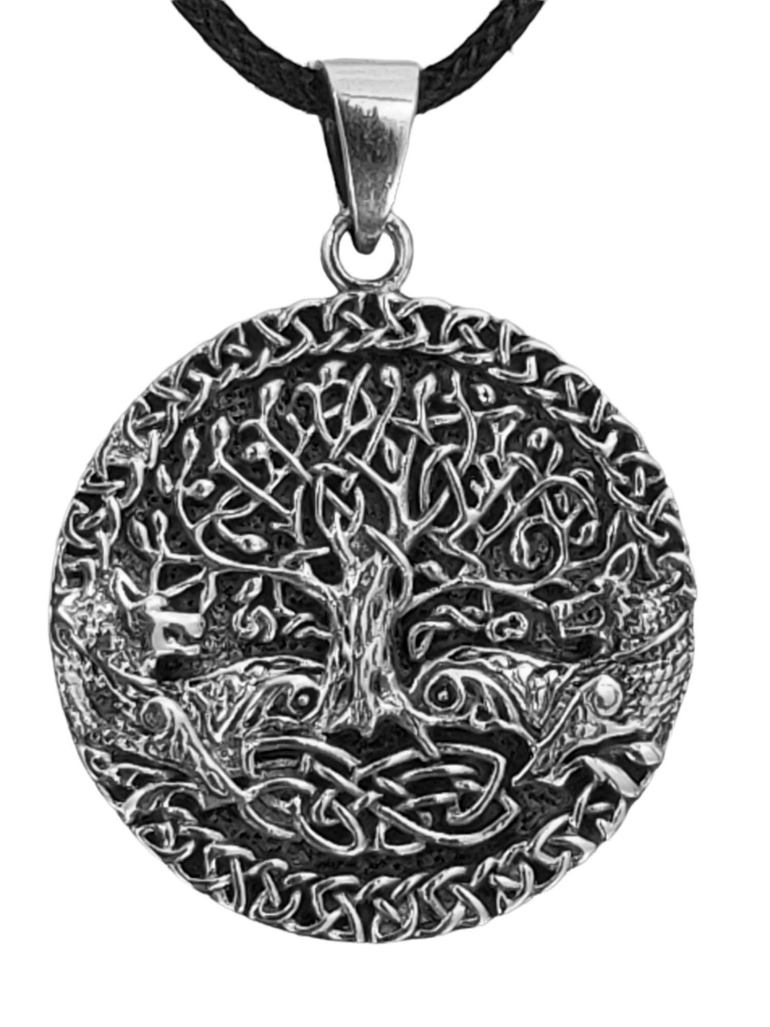 Das zentrale Element des Schmuckanhängers stellt der Lebensbaum Yggdrasil dar. Seine Wurzeln und Zweige bilden ein filigranes Knotenmuster.