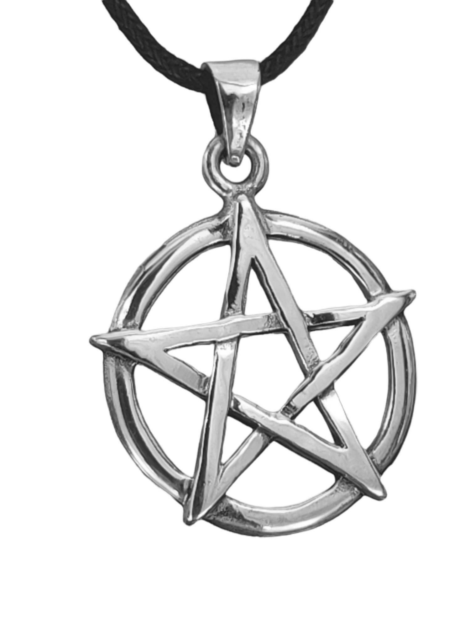 Kunstvoll gestaltetes Pentagramm aus 925 Sterling Silber. Das magische Symbol ist von einem schlichten Ring umgeben.