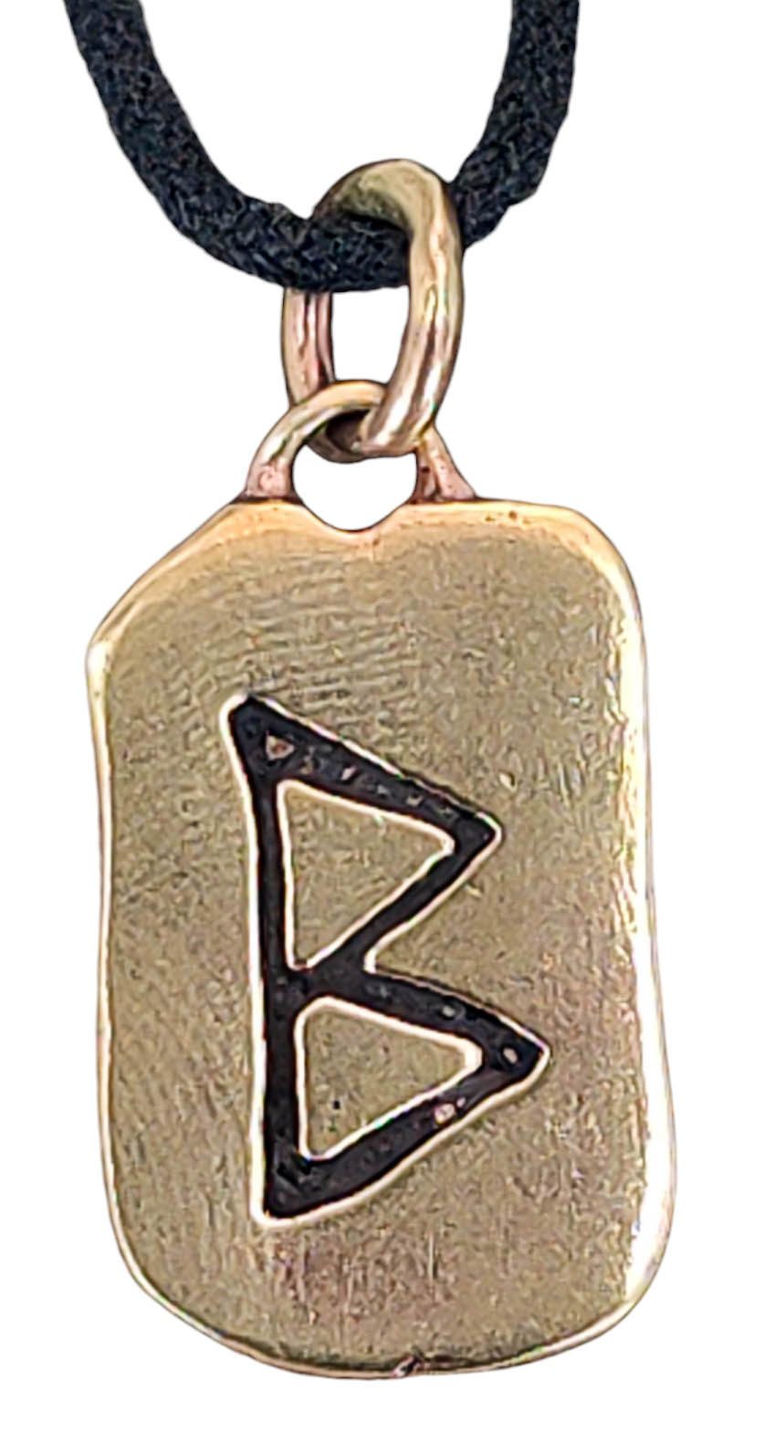 Kunstvoll gestaltetes Amulett aus Bronze mit eingravierter Berkana-Rune auf der Vorderseite. Die Rückseite ist glatt poliert.
